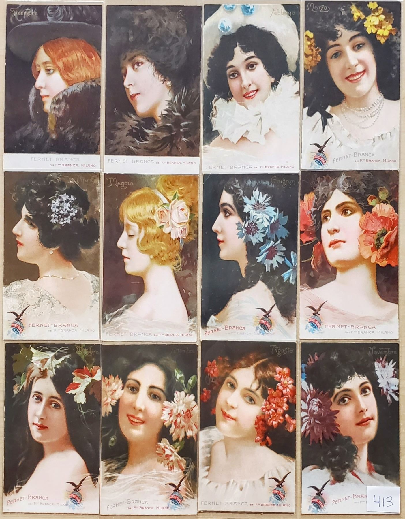 12 card Set of Months Fernet-Branca Alcohol Advertising Ladies Postcards