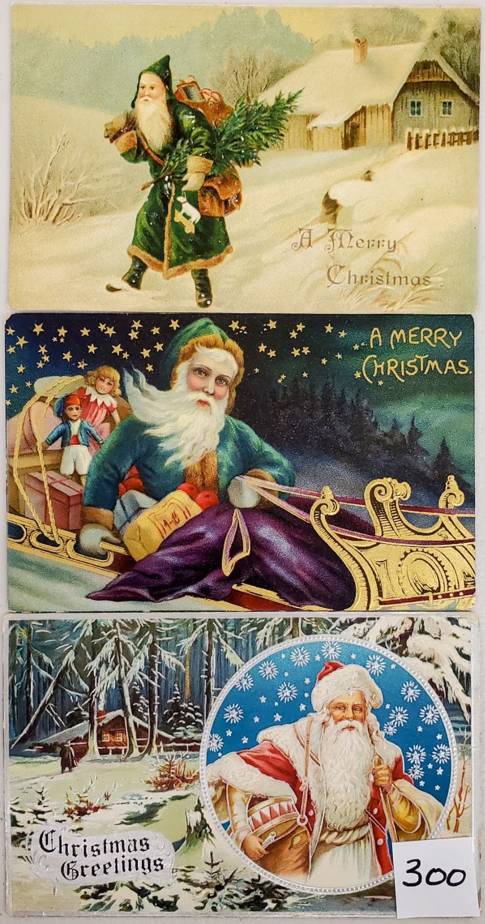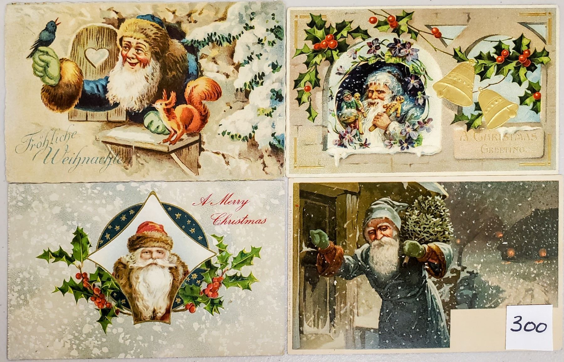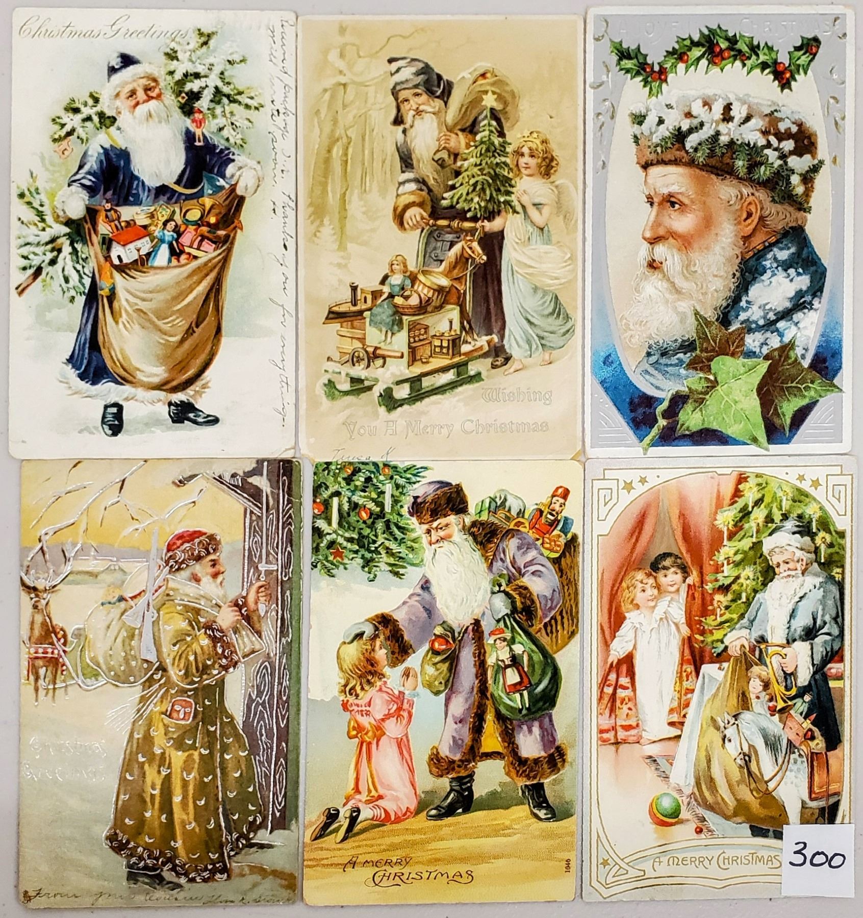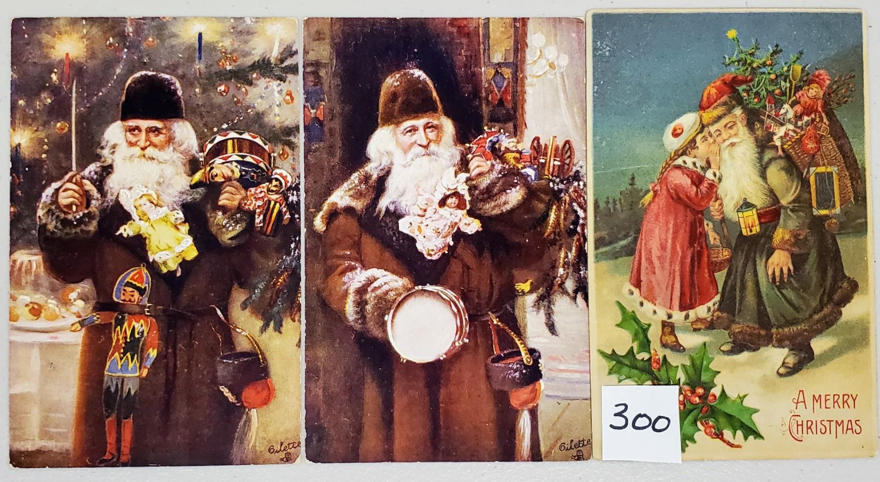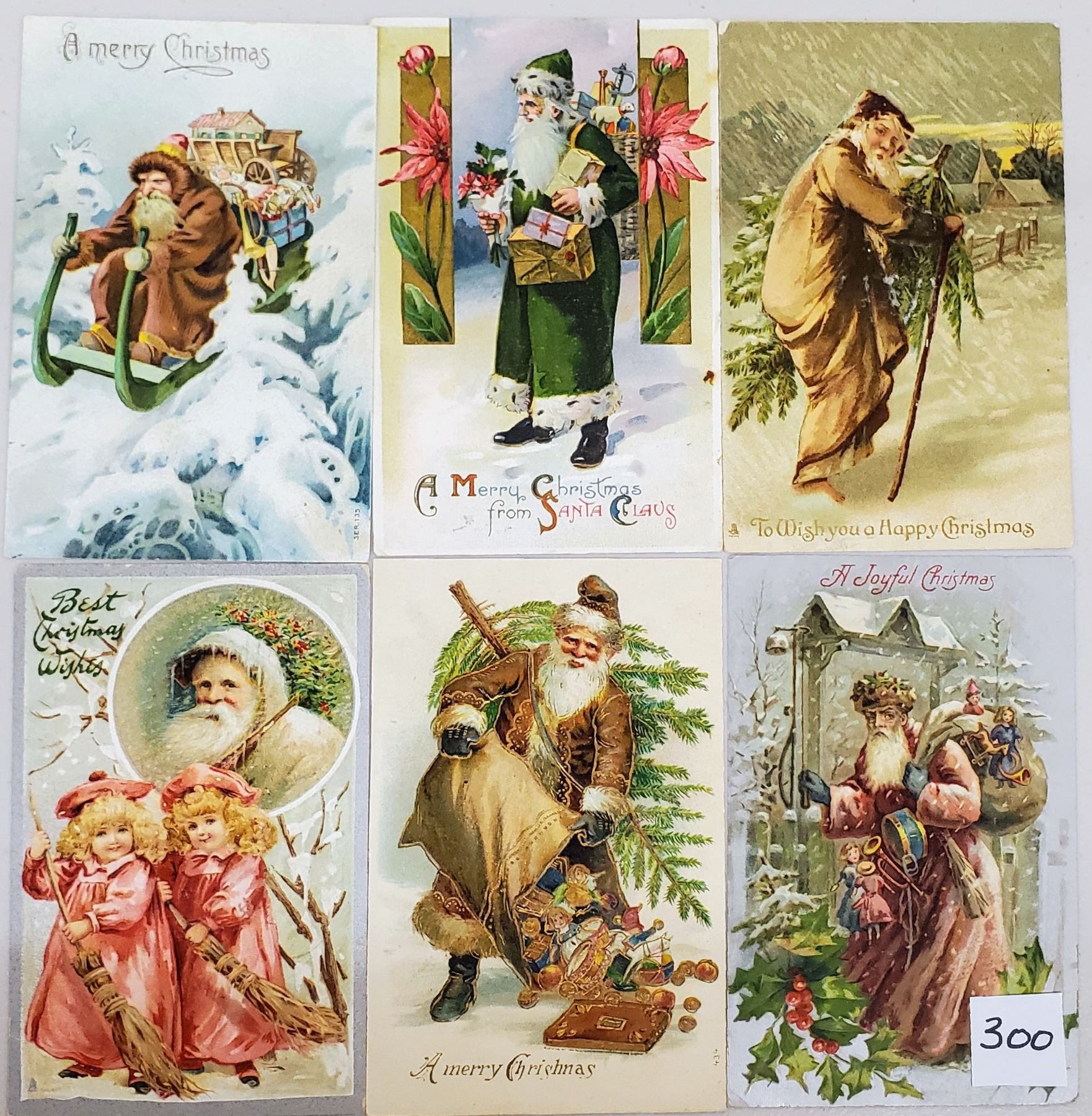 22 Santa Claus postcards. Many different color robes. Mostly good to excellent condition. One with a small corner missing. Several Tucks.