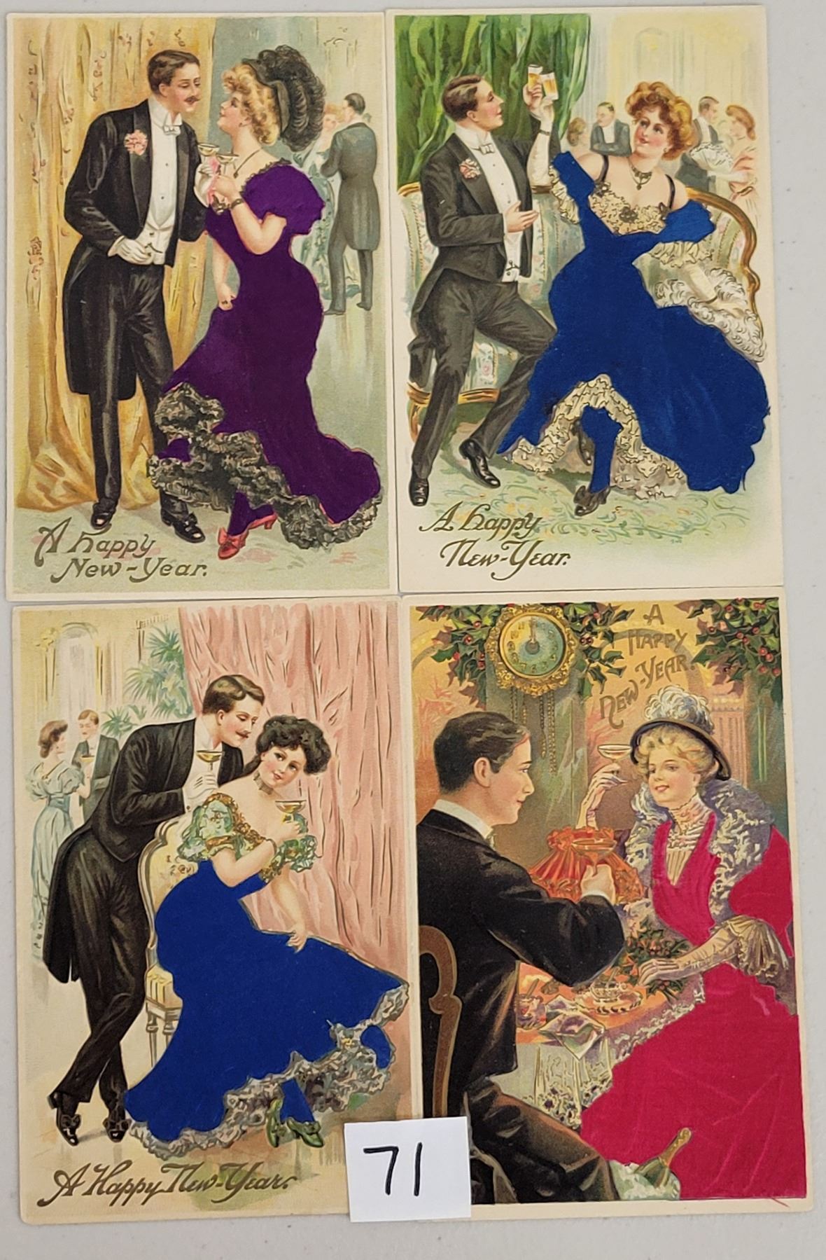 4 Romance Couple New Year Silk Dresses Holiday Postcards