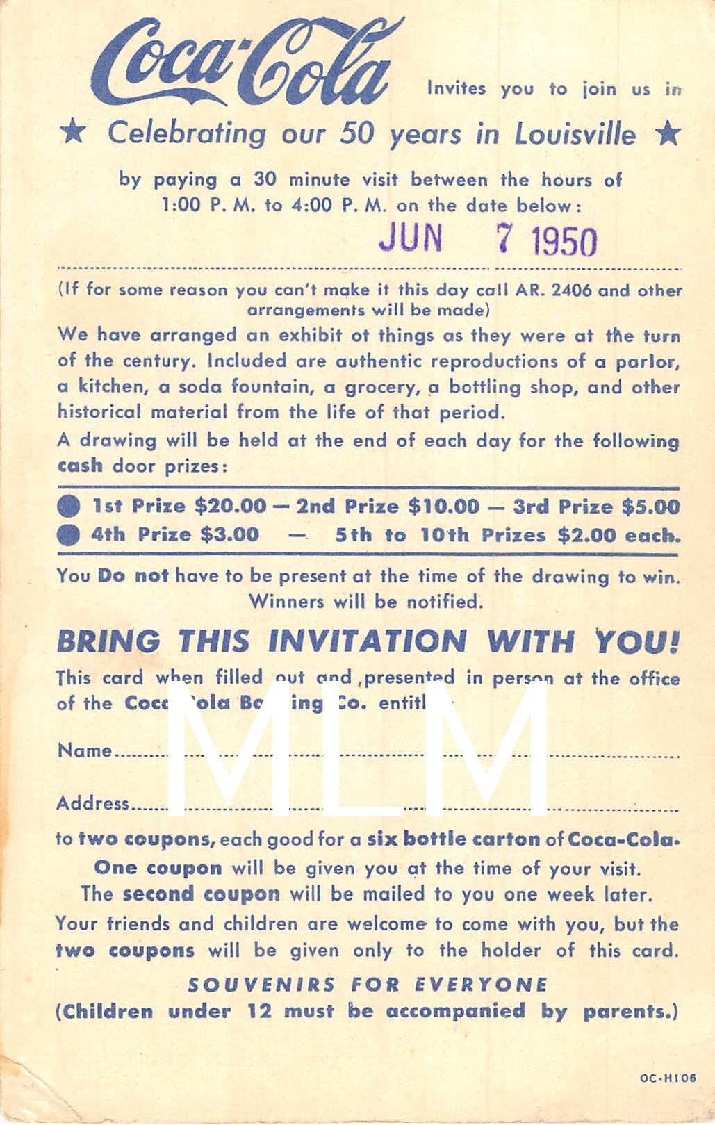 50th Anniversary Invitation Coca-cola Bottling Company Louisville, Kentucky Linen