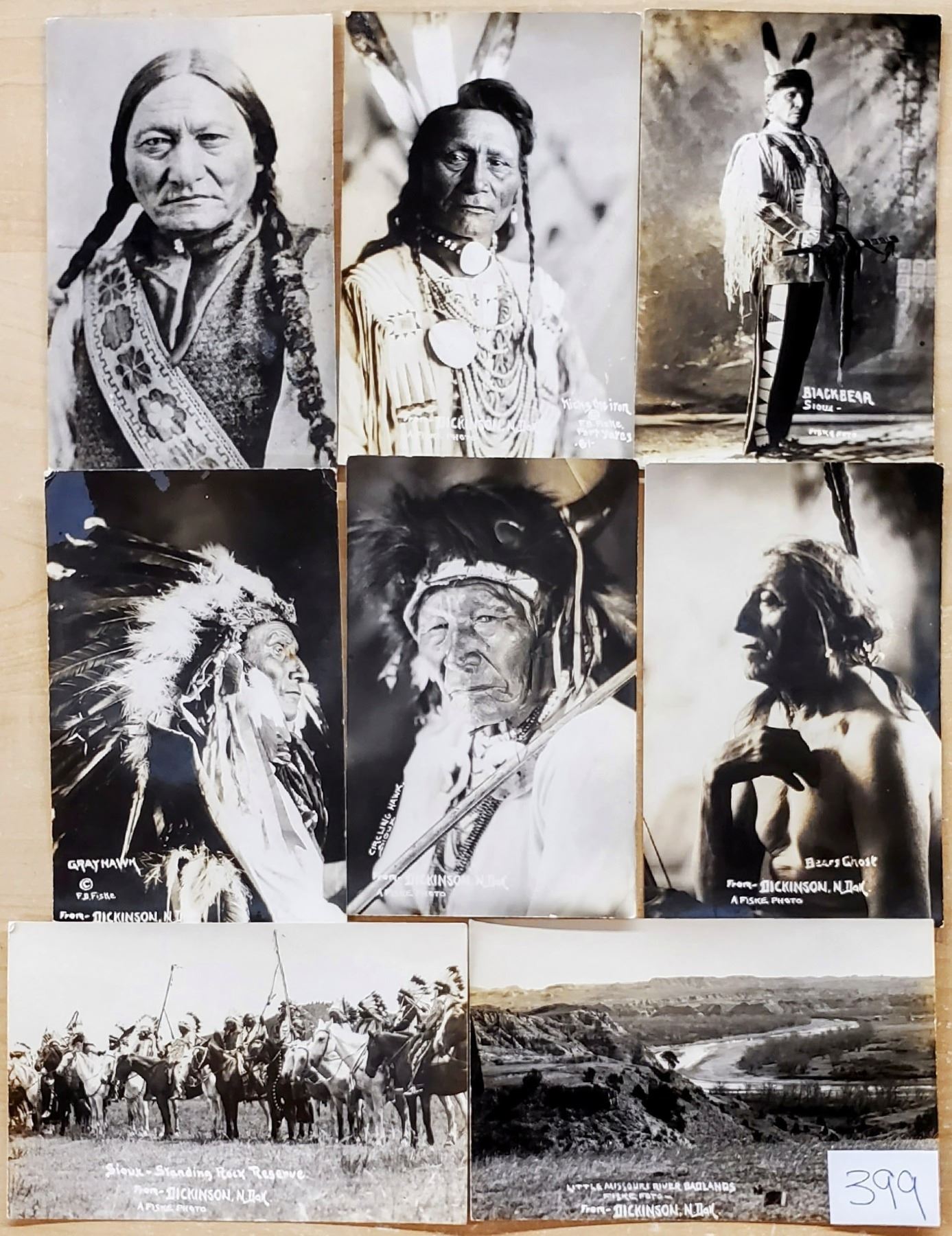 8 different. Sioux Indians and related from Dickinson, ND. One only showing land, other seven show Indians. Unused.