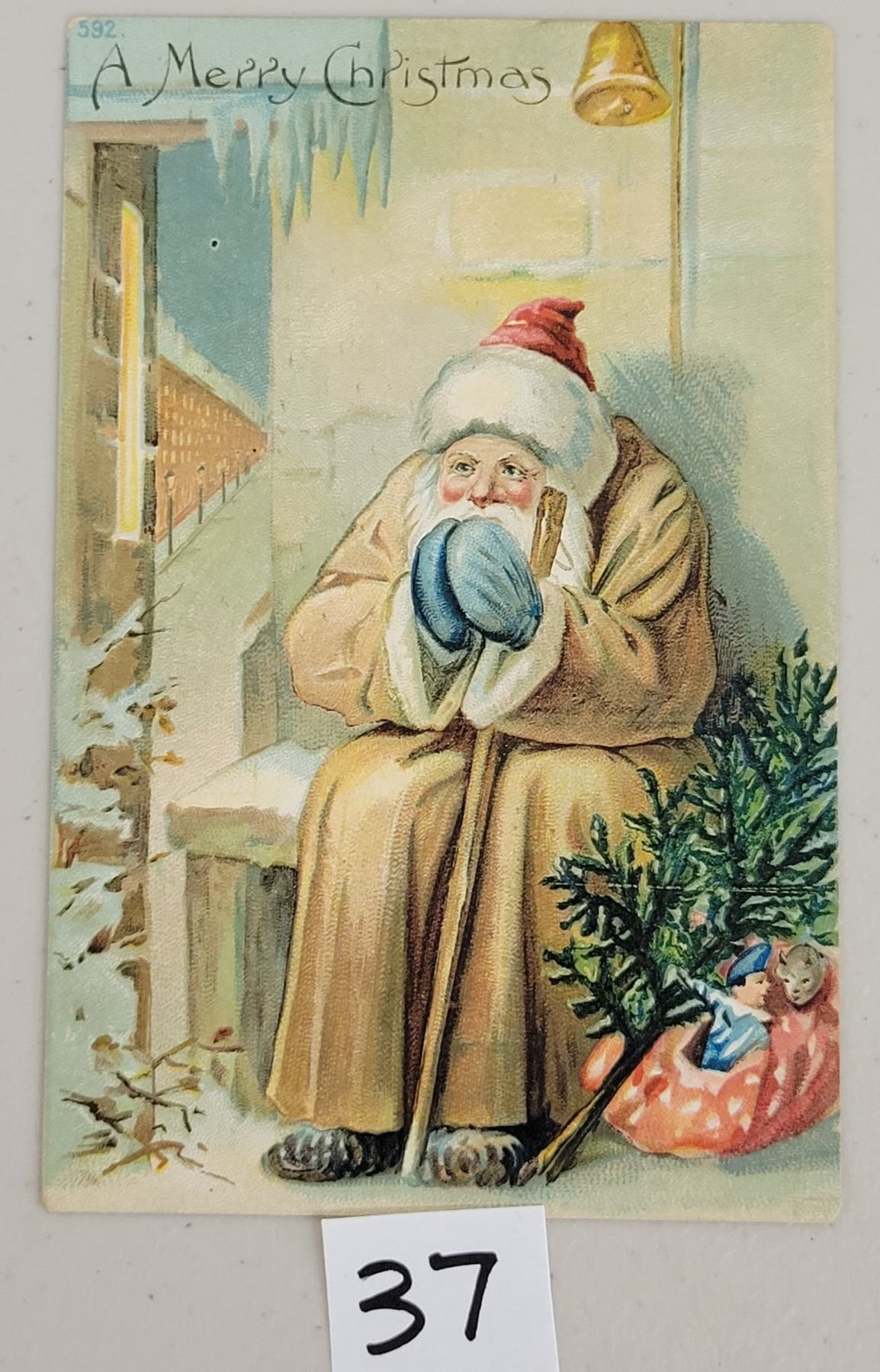 A Merry Christmas Santa Claus in White on Bench Postcard