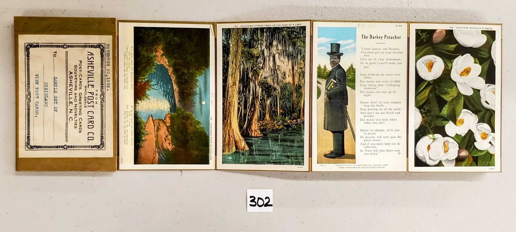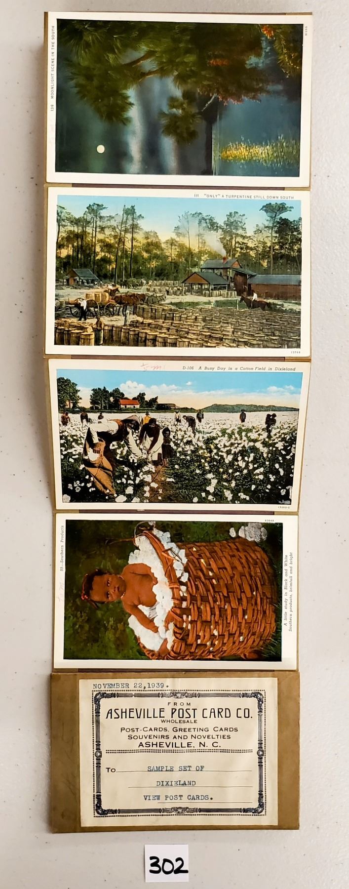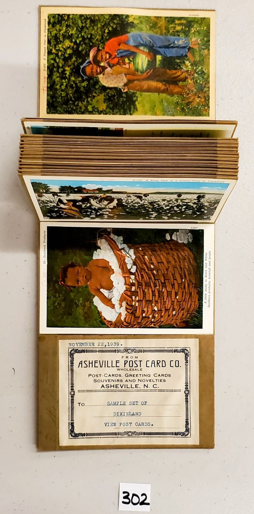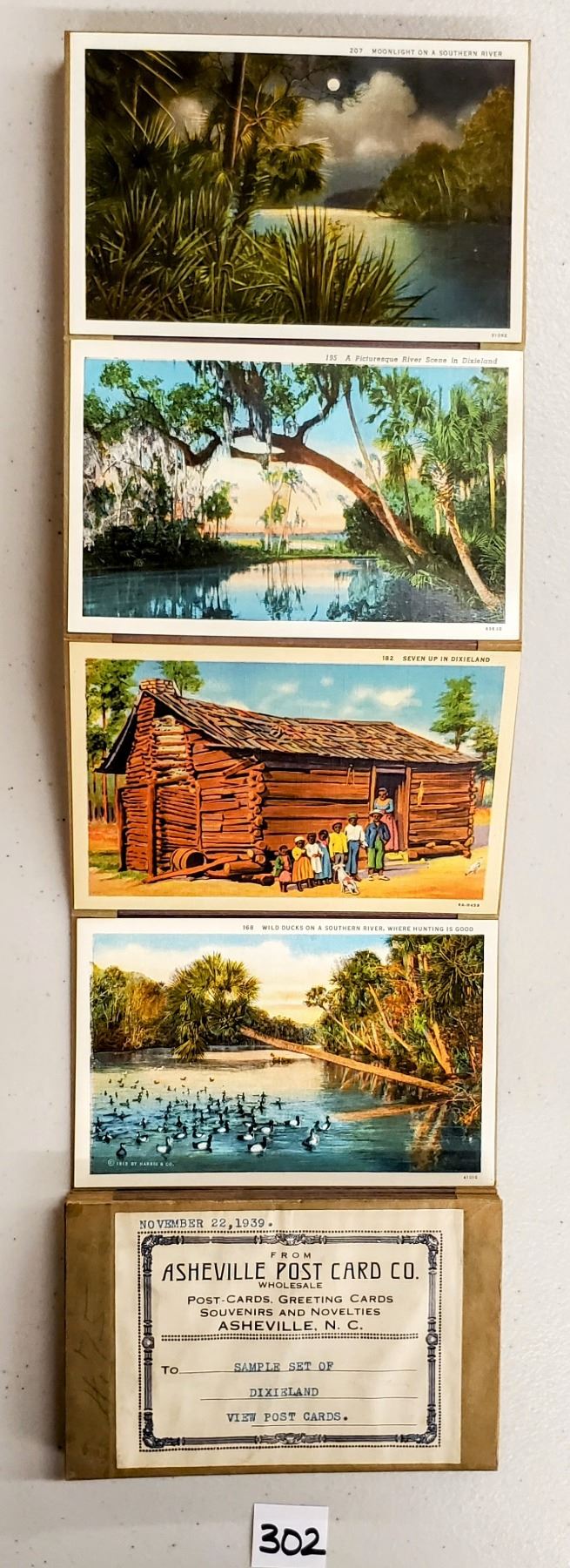 Accordian sales set with the cards attached for sample of the Dixieland View postcards. Approx. 65 cards. Early.