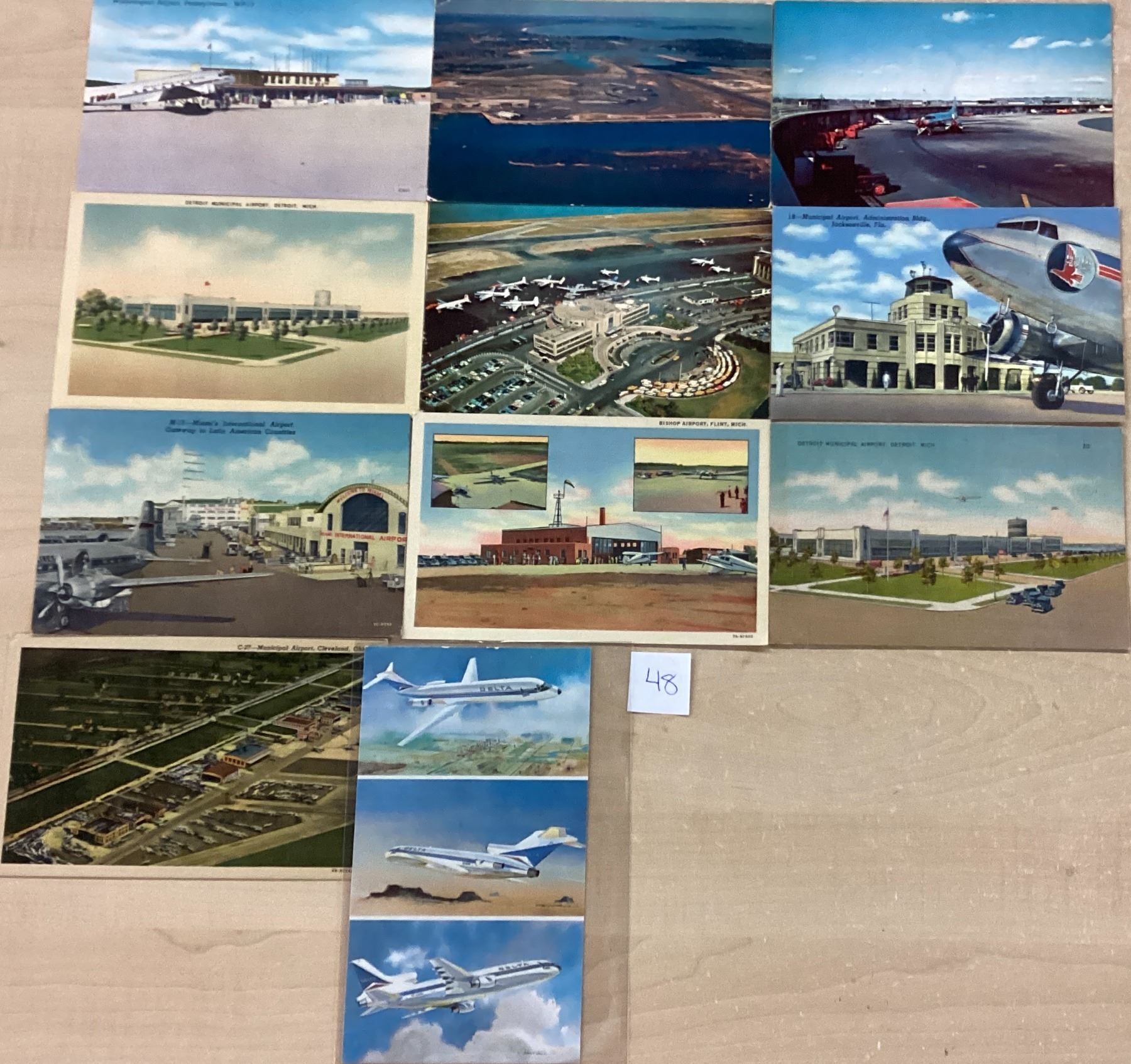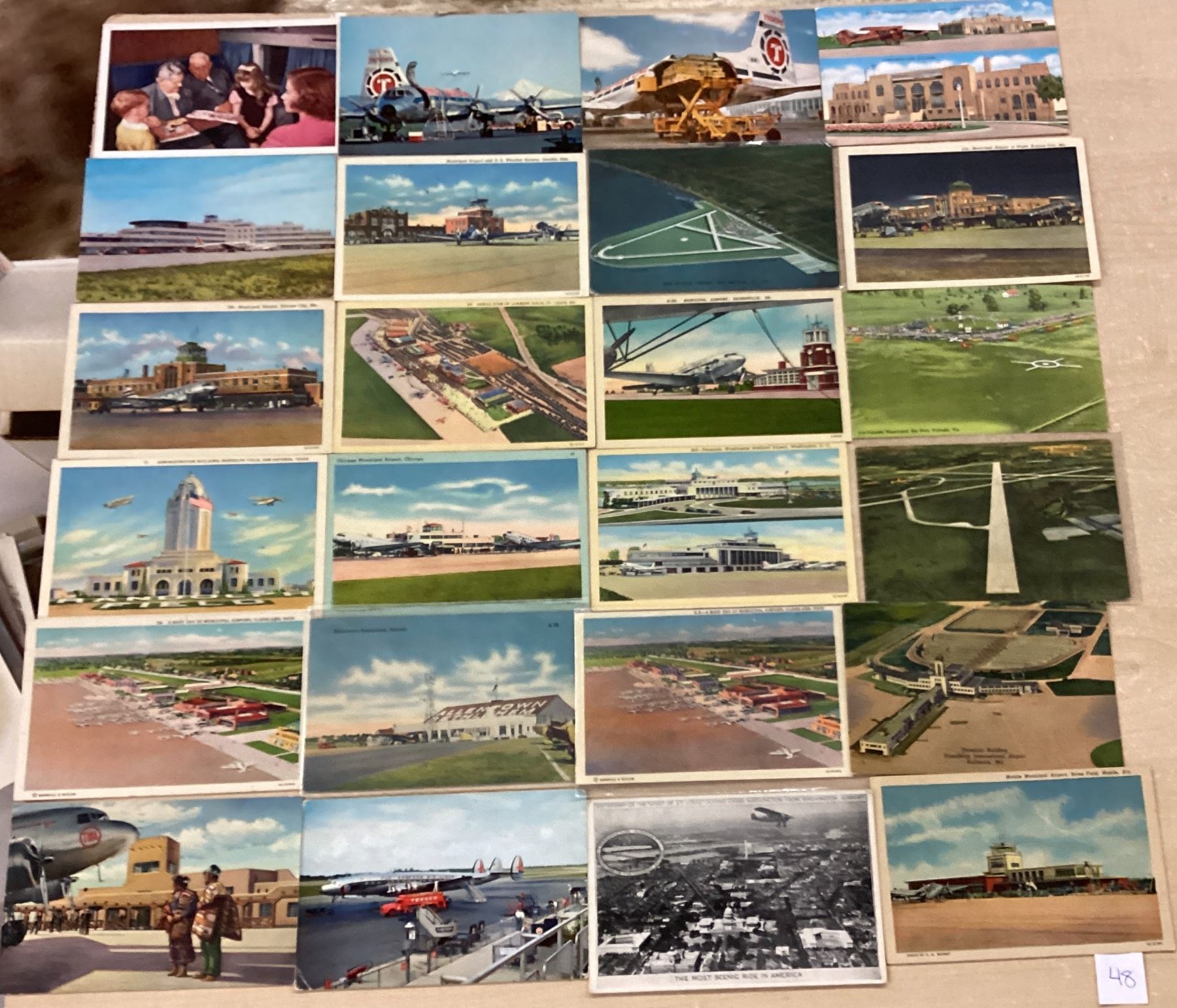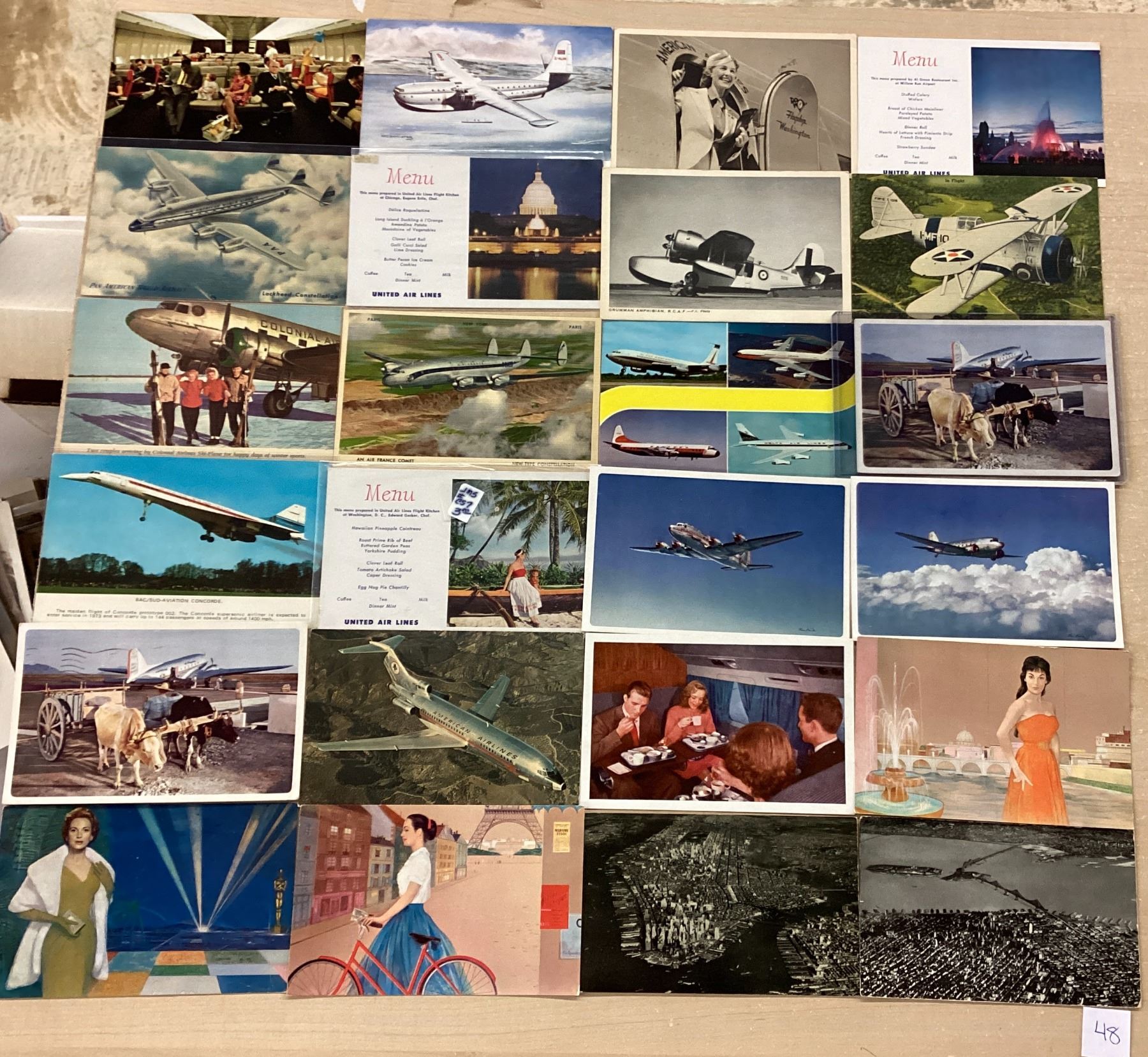 Over 55 aviation & related postcards. Airports, menus, airlines, etc. Early to standard size chrome.