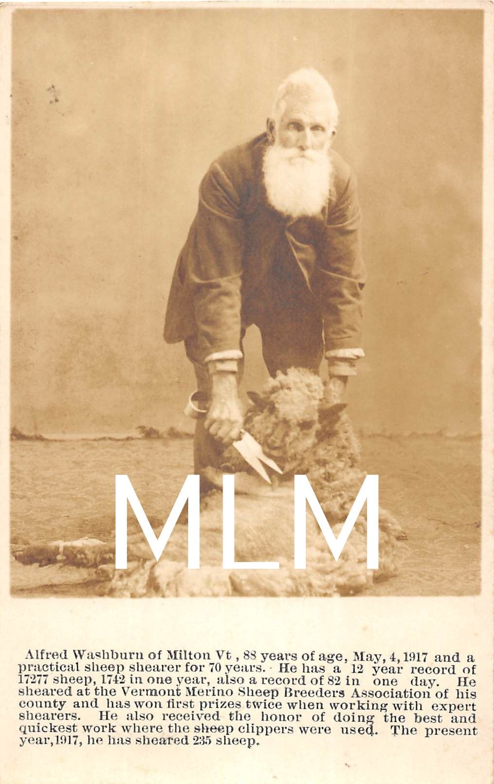 Alfred Washburn of Milton, Vermont at 88 Years of Age Shearing Sheep Photo Postcard