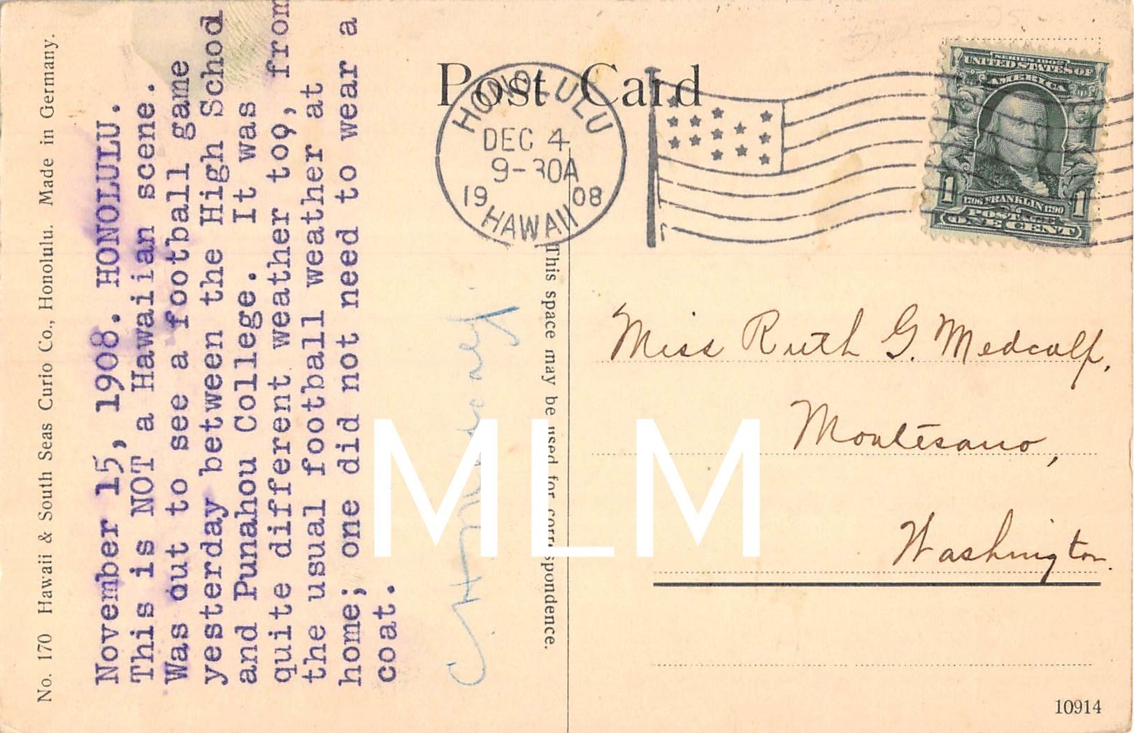 No. 170 Hawaii & South Seas Curio. Co. Postal used, Hawaii 1908. Message about football game on back.