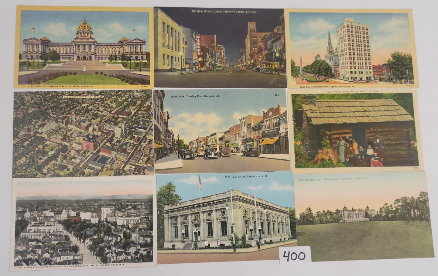 Approx. 285 early to linen USA postcards. Aerial views, street scenes, buildings, etc.