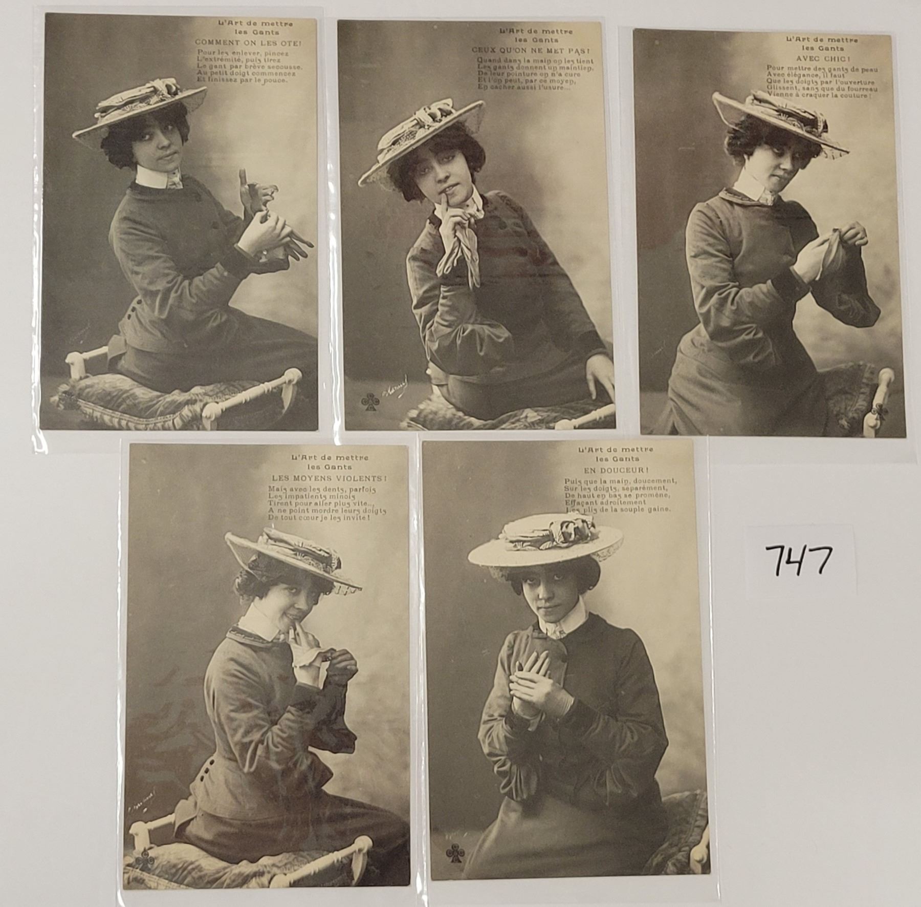 5 early lady in gloves postcards. L'art de mettre les cants.