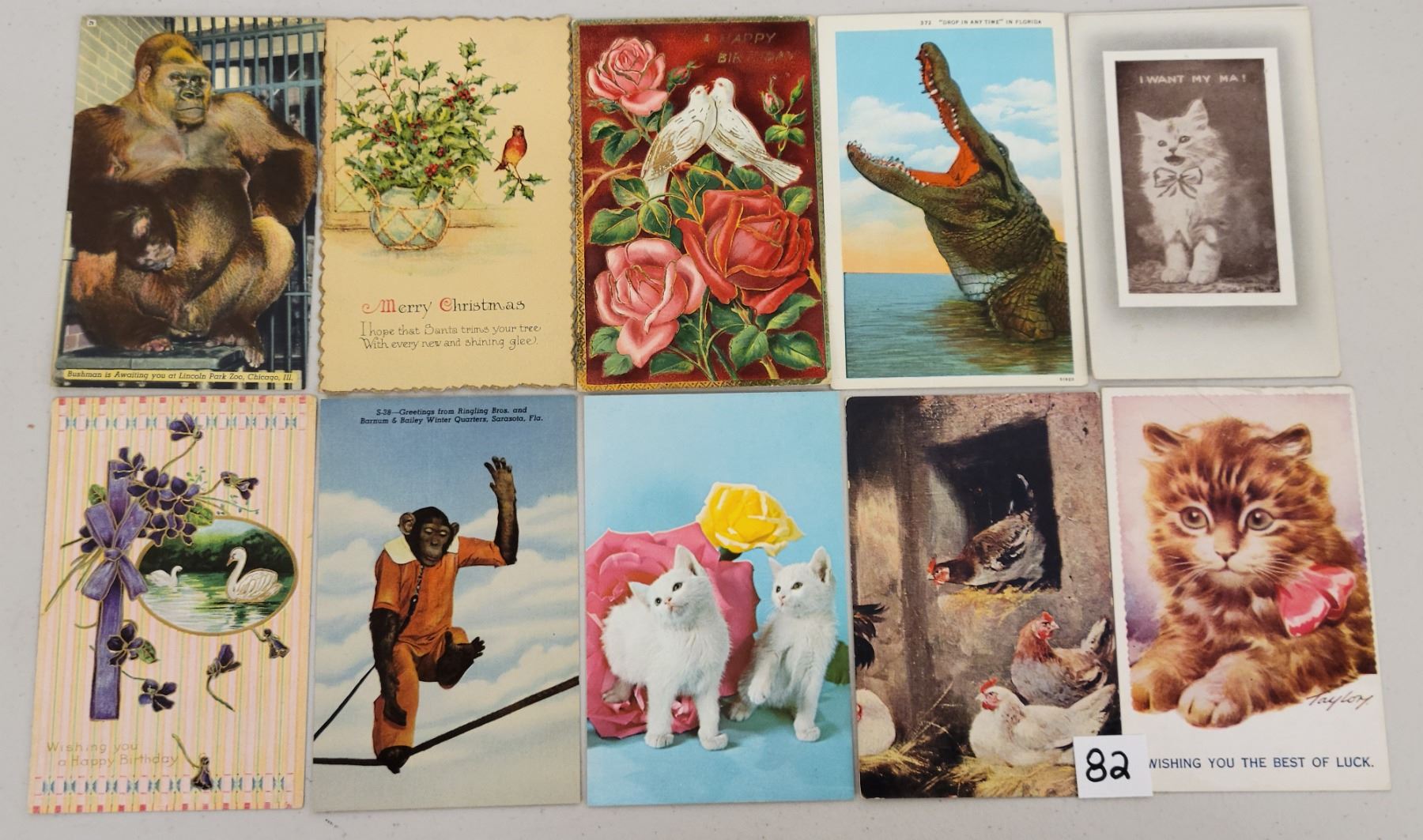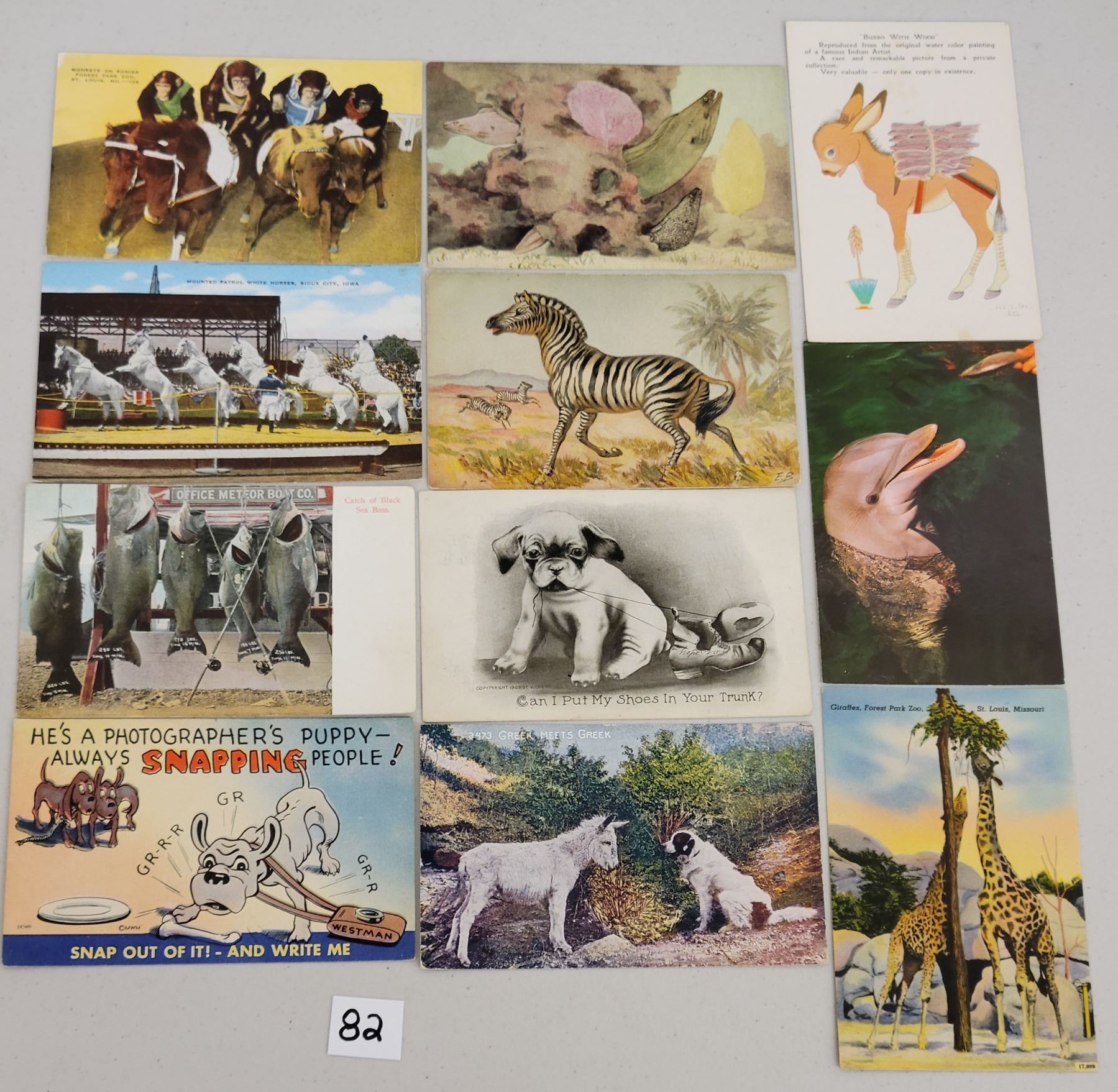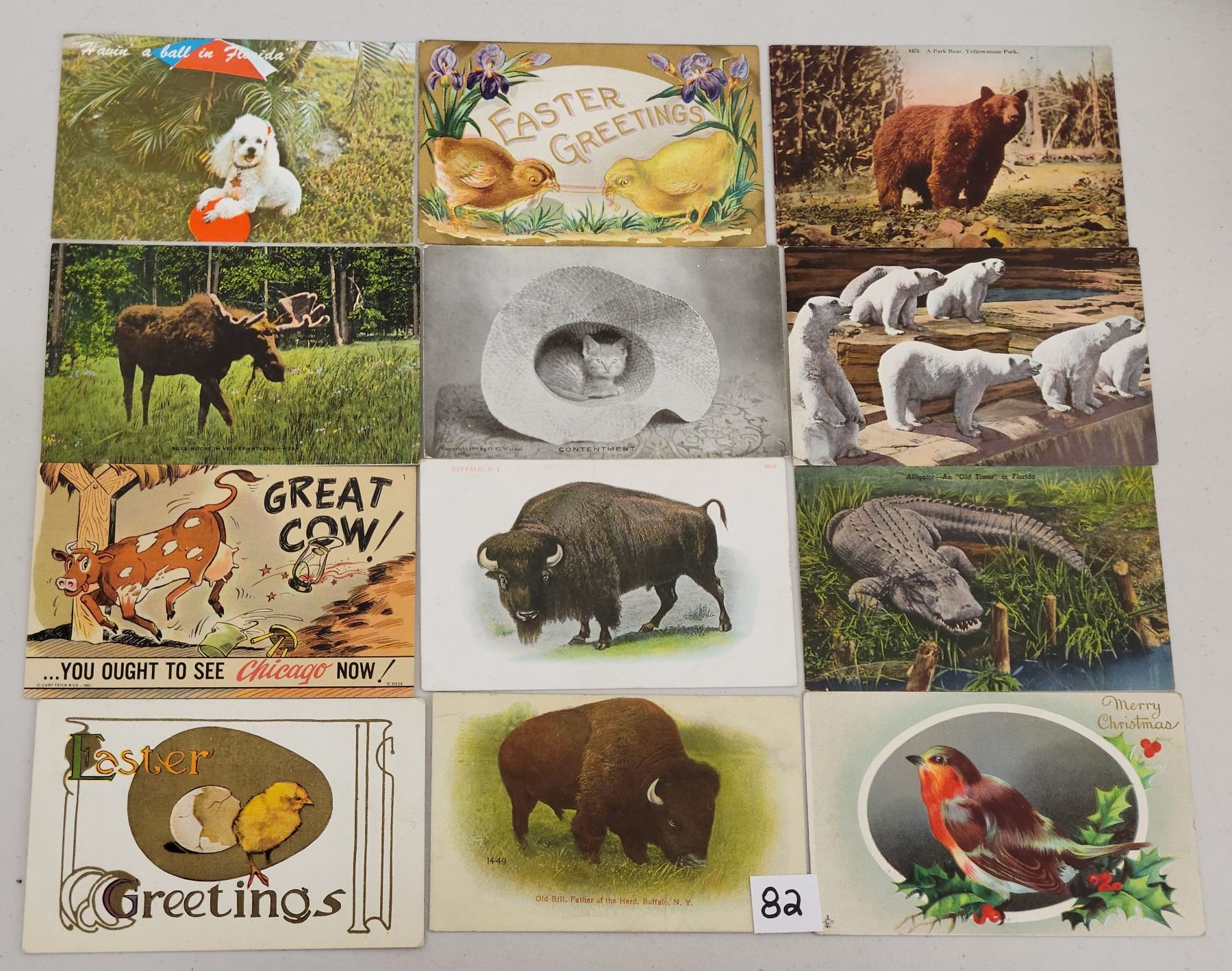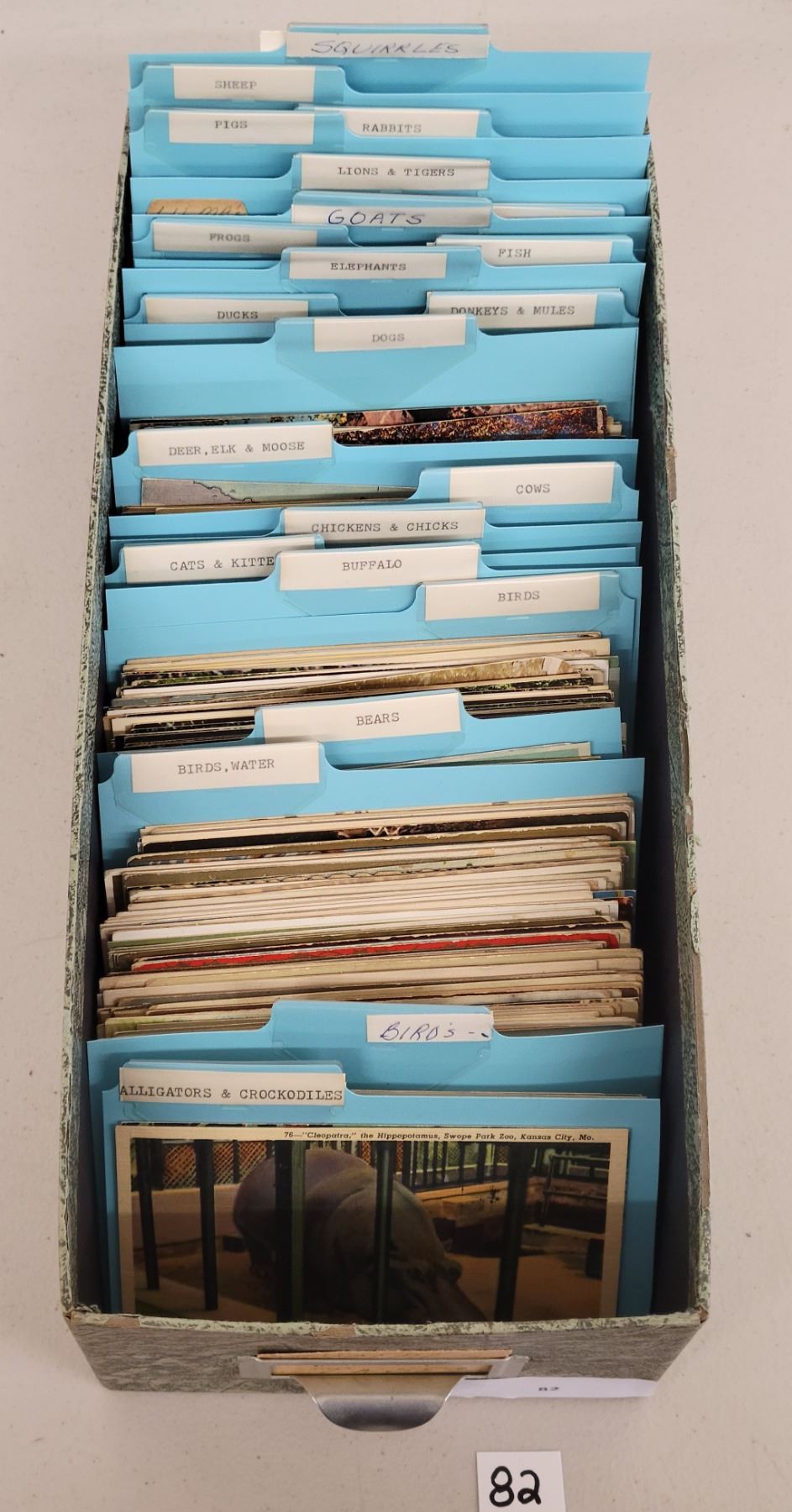 Over 675 postcards of animals. Sorted into over 20 sections. Birds, bears, cows, cats, dogs, deer, fish and more. Early to standard size chrome.