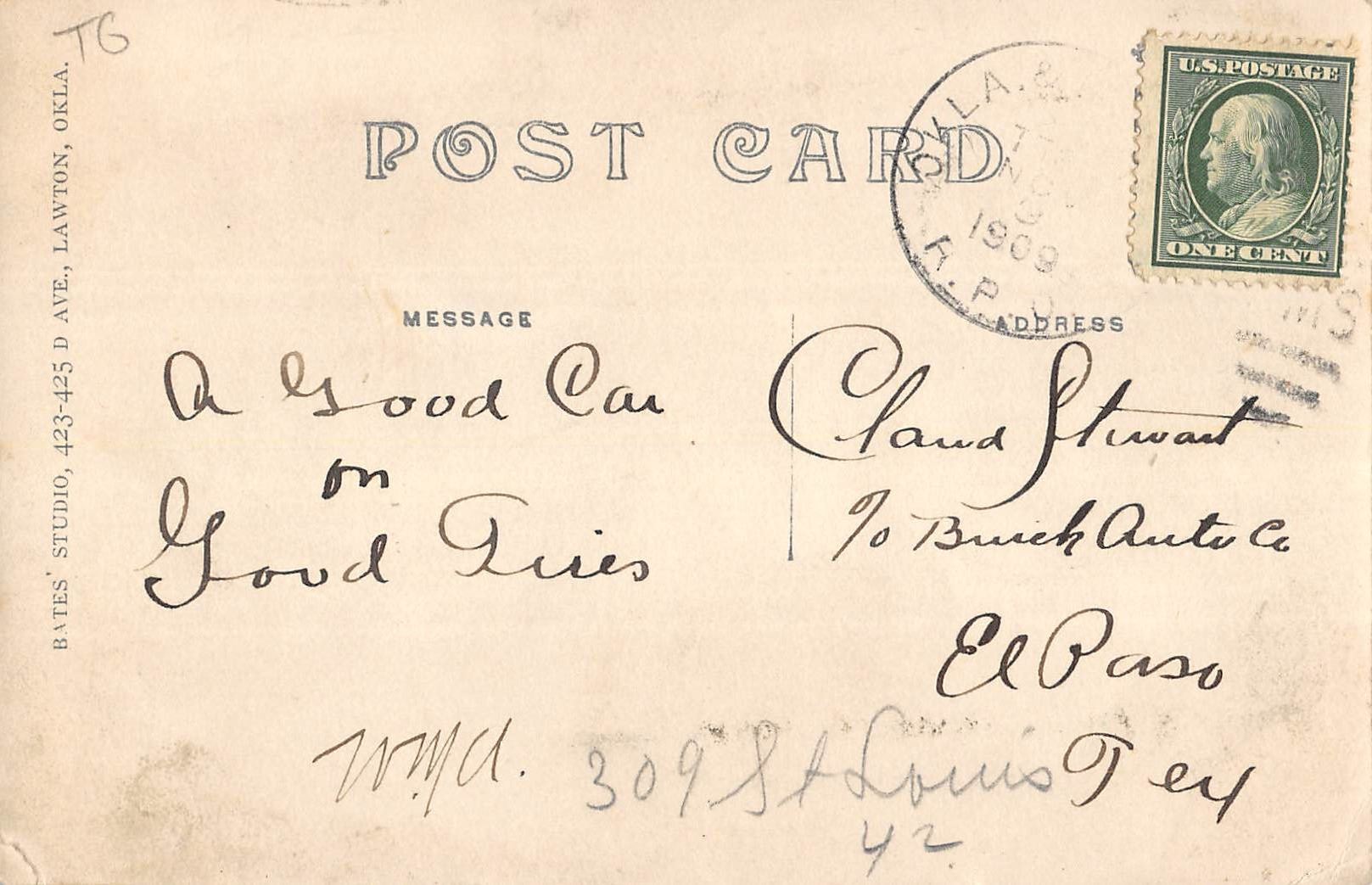 Postmarked 1909. Lower corner small creases.