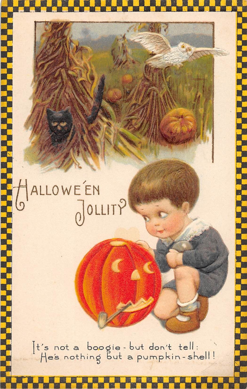 Checkered Boarder Winsch Halloween Jollity Boy & Pumpkin Holiday Greeting PC