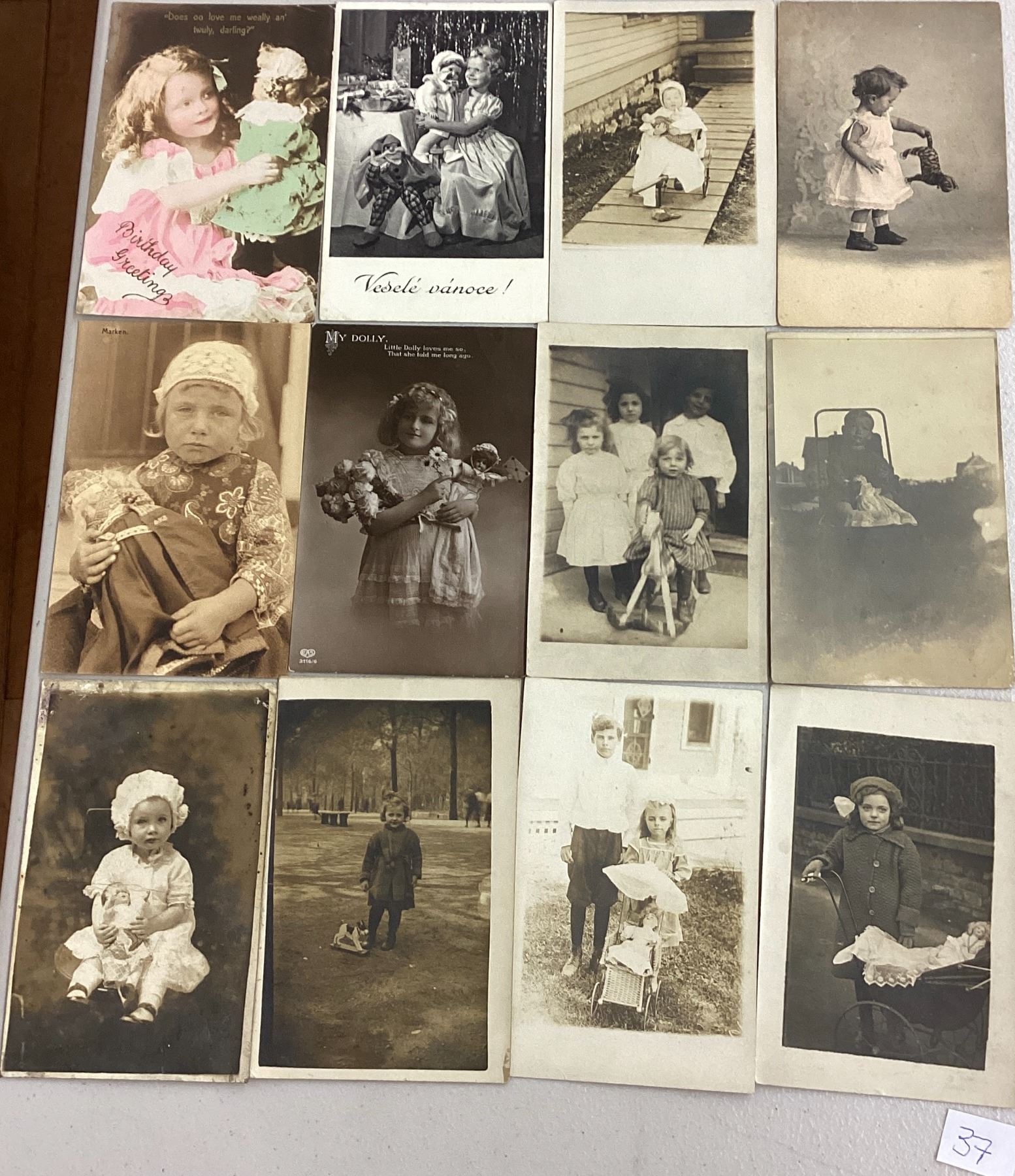 18 postcards of children with toys and dolls. Early. Many real photo.