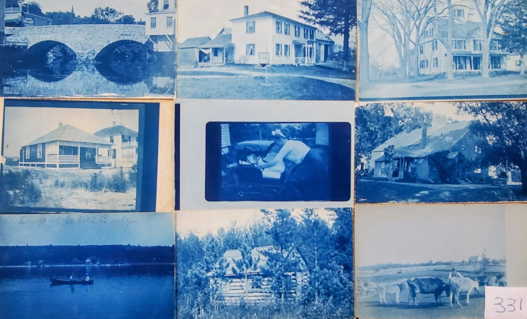 Approx. 60 blue photo postcards. People, houses, scenes, etc.