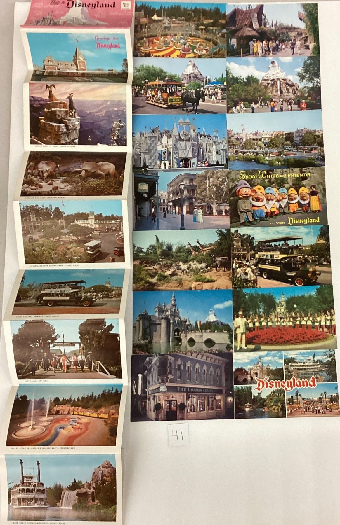 Over 65 Disneyland postcards. Standard size chrome, 1 folder.
