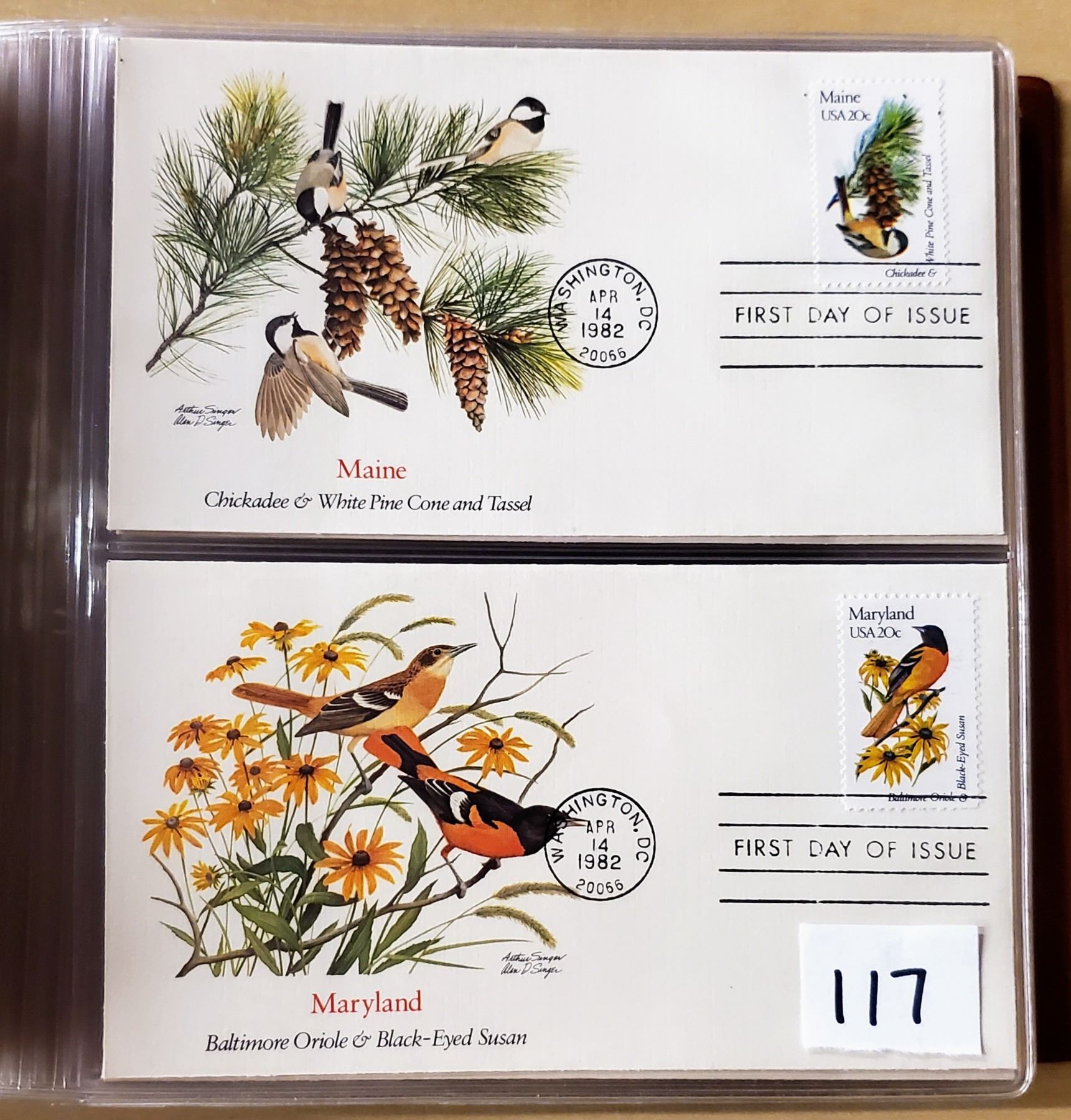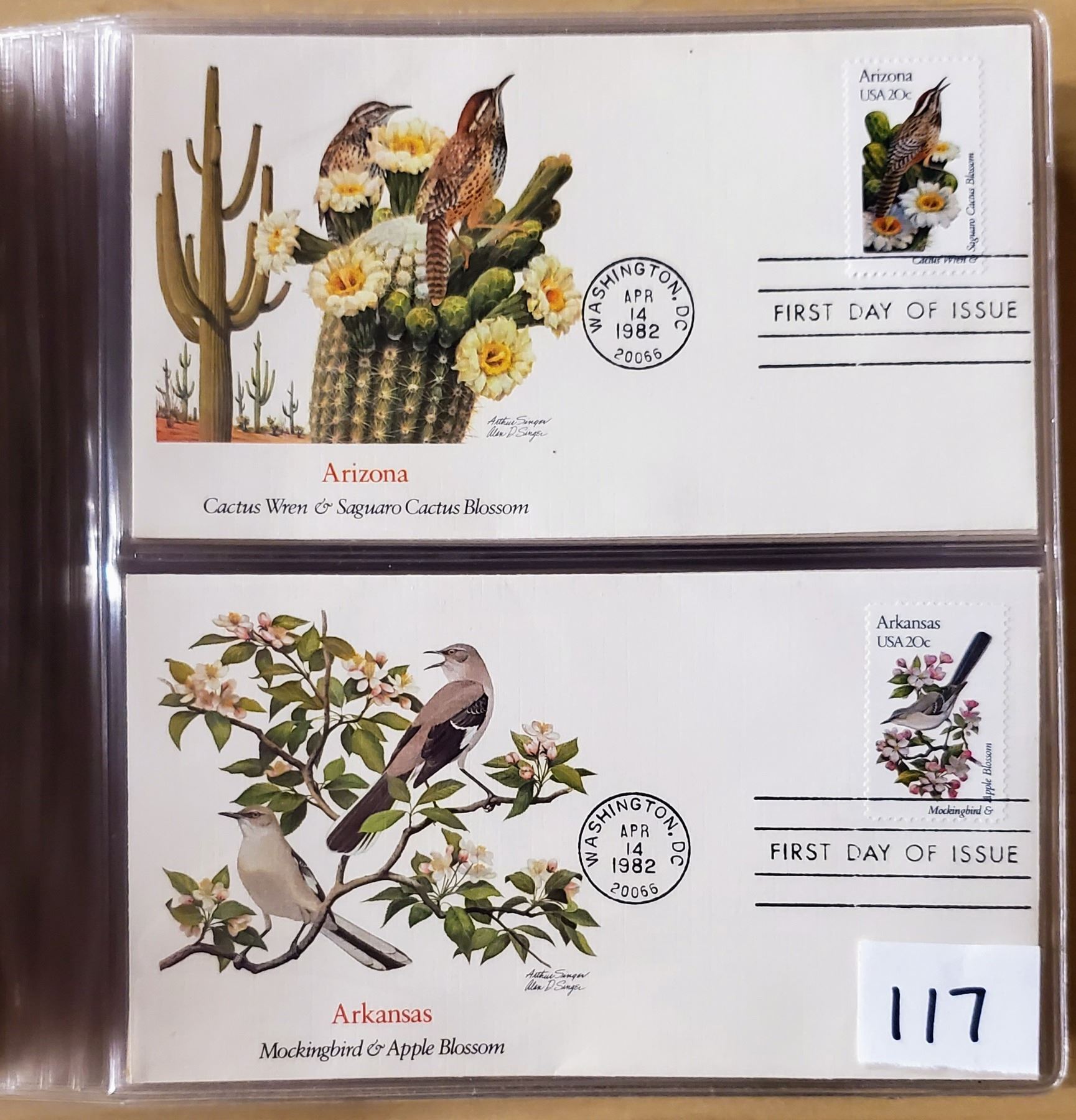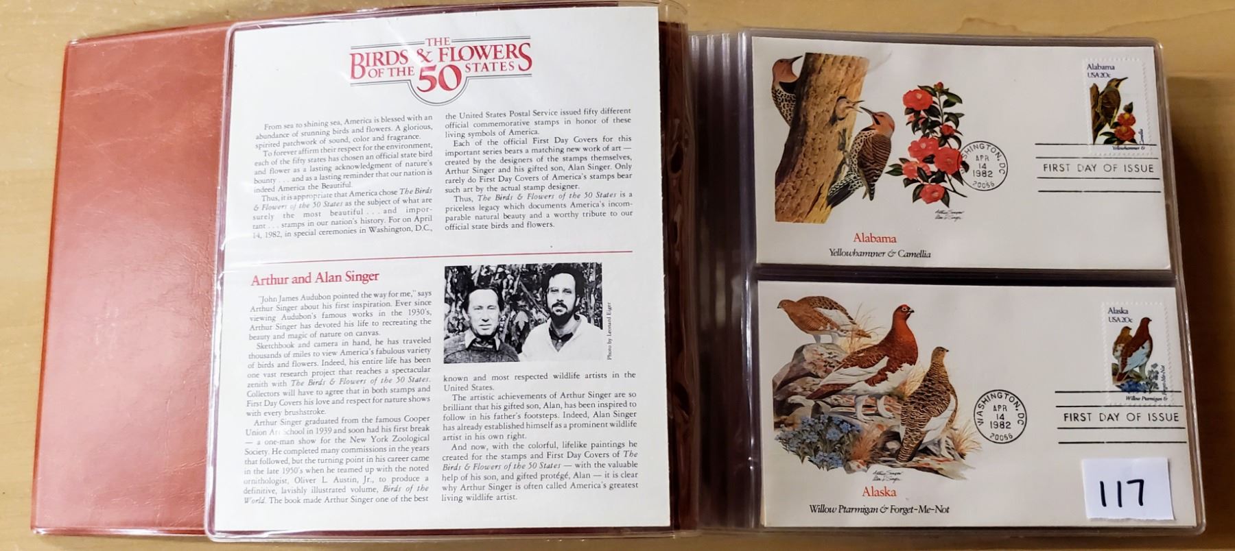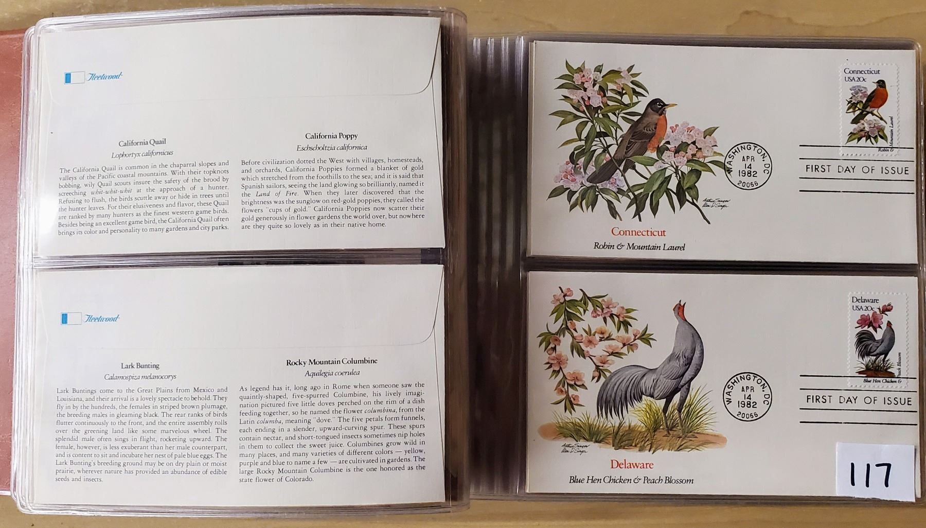 Album of all 50 First Day issue Birds & Flowers stamps. April 12, 1982.