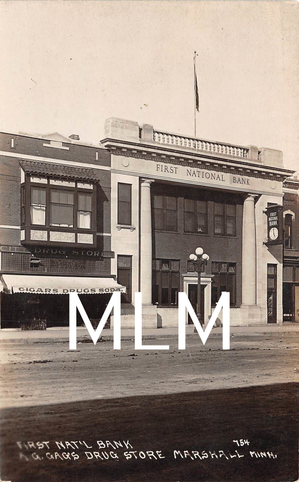 First National Bank & Drug Store Front Marshall, Minnesota Photo Postcard