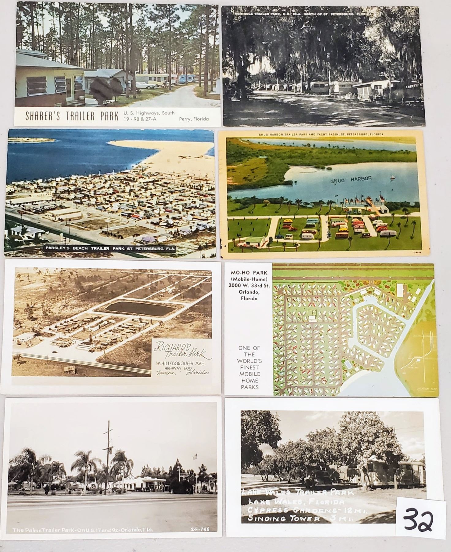 Over 25 Florida trailer park postcards. Early to standard size chrome. Several real photo.