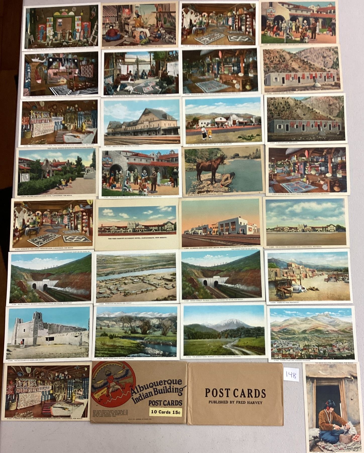30 Fred Harvey New Mexico postcards. Several American Indian postcards. Also has two envelopes.