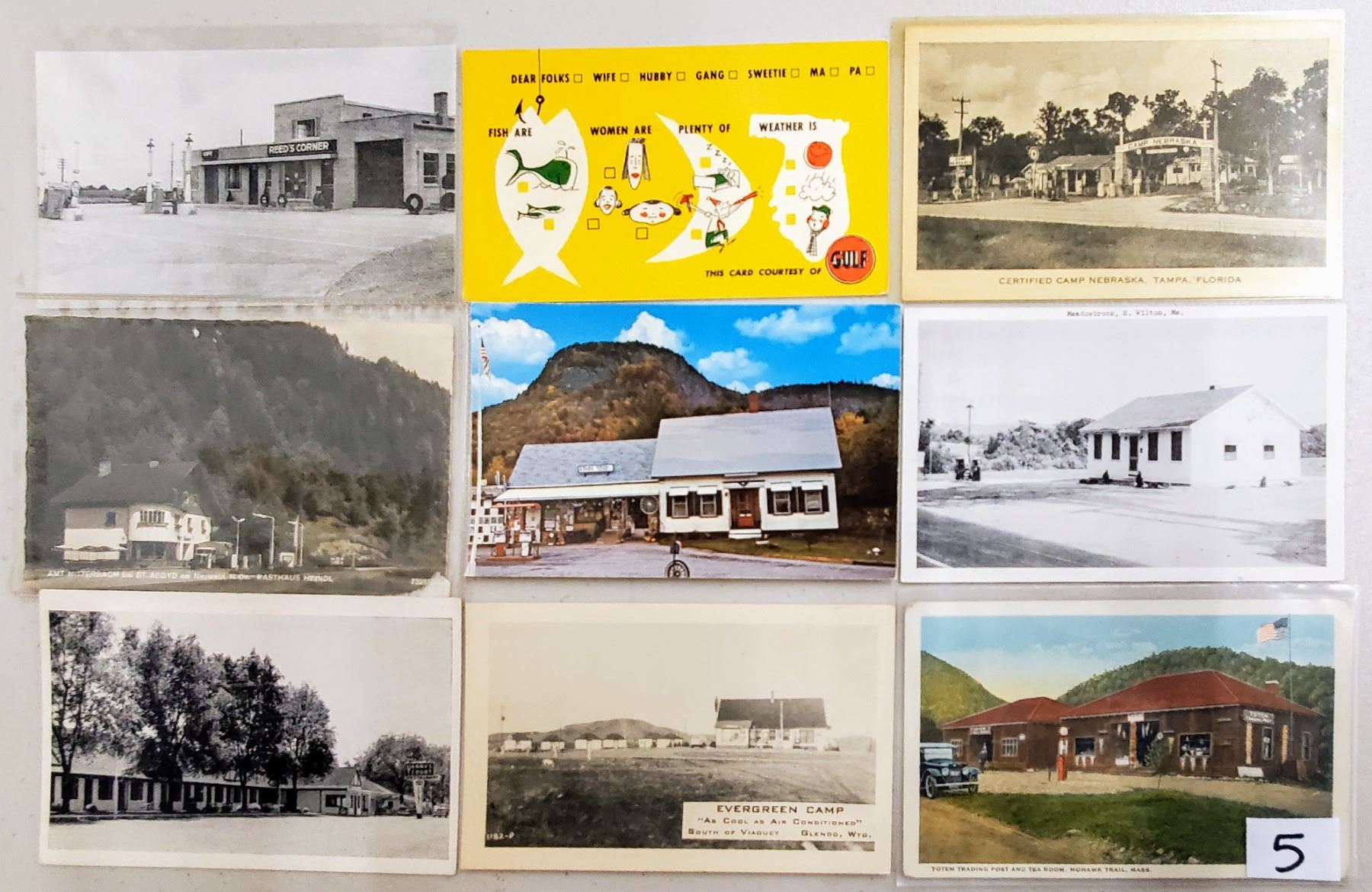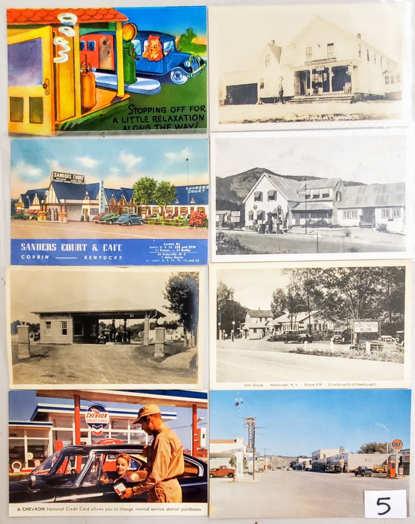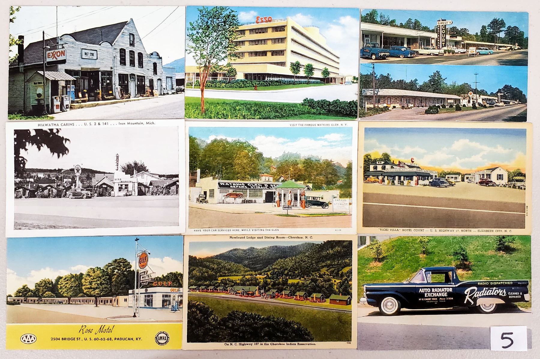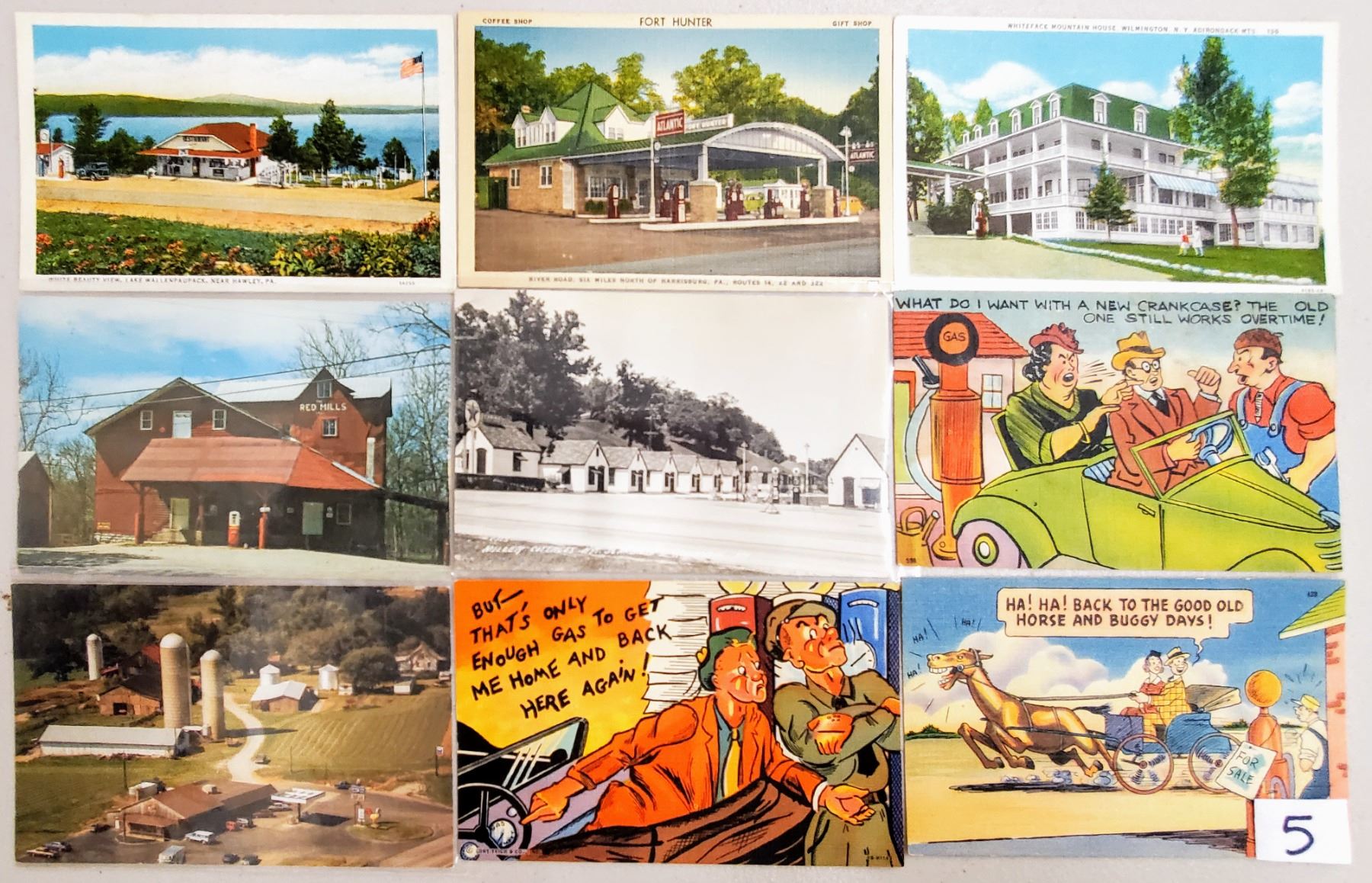 Over 50 gas station postcards. Early to standard size chrome. Some real photo. Stations, comics, etc.