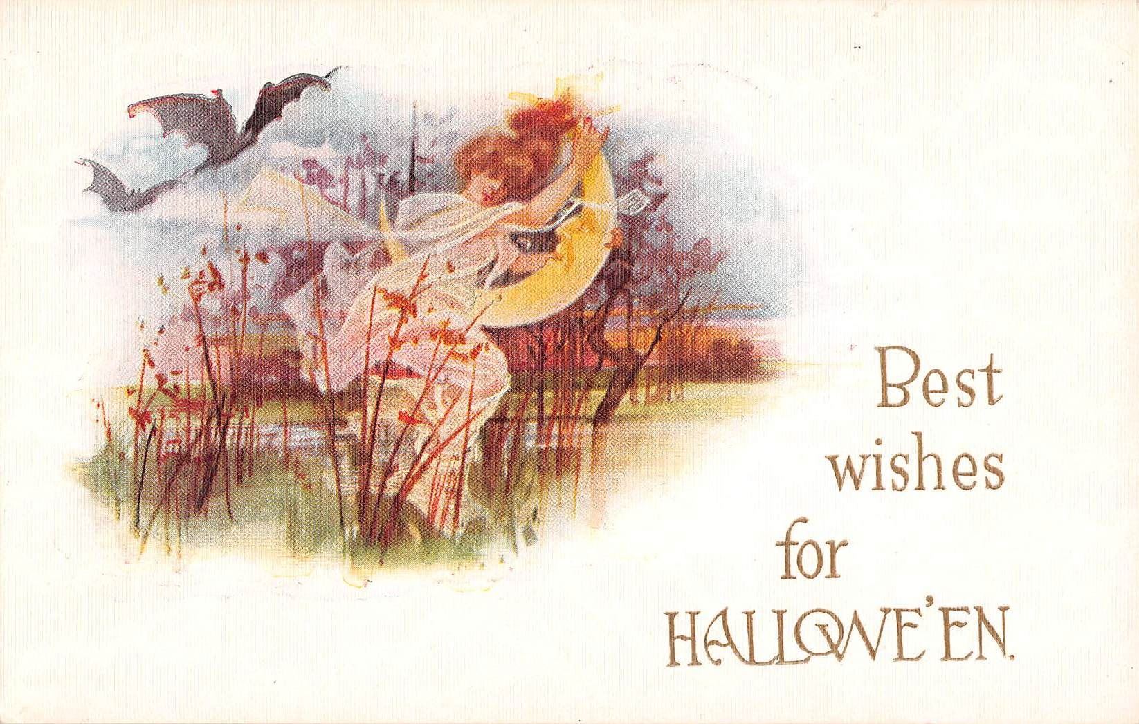 Gibson Best Wishes for Halloween Bats Chasing Woman & Moon Postcard