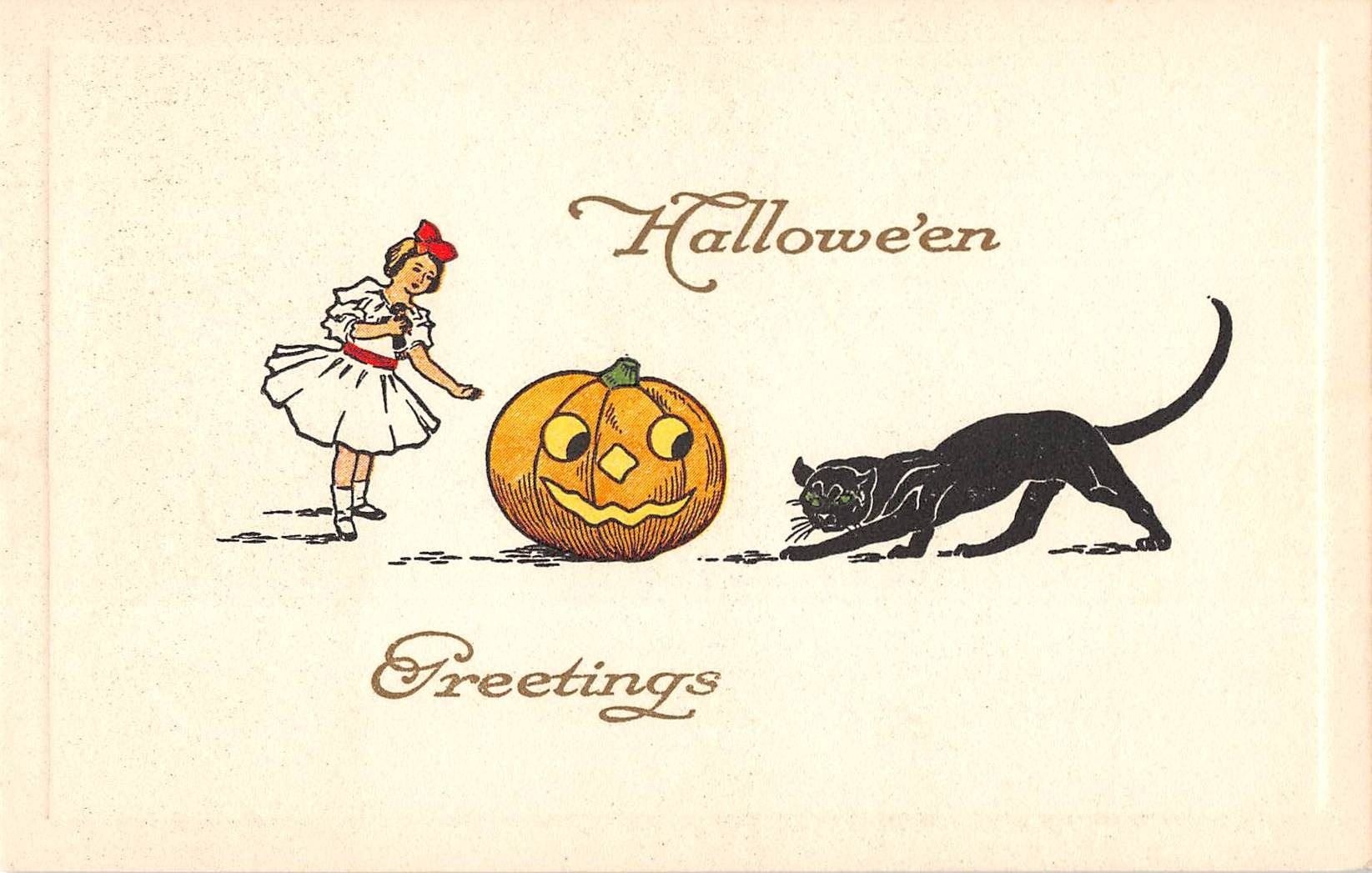 Gibson Halloween Greetings Girl with Pumpkin & Black Cat Postcard