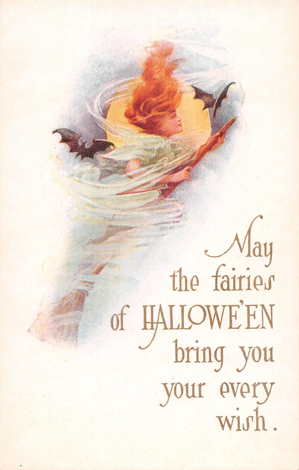 Gibson The Fairies of Halloween Witch on Broom & Bats Postcard