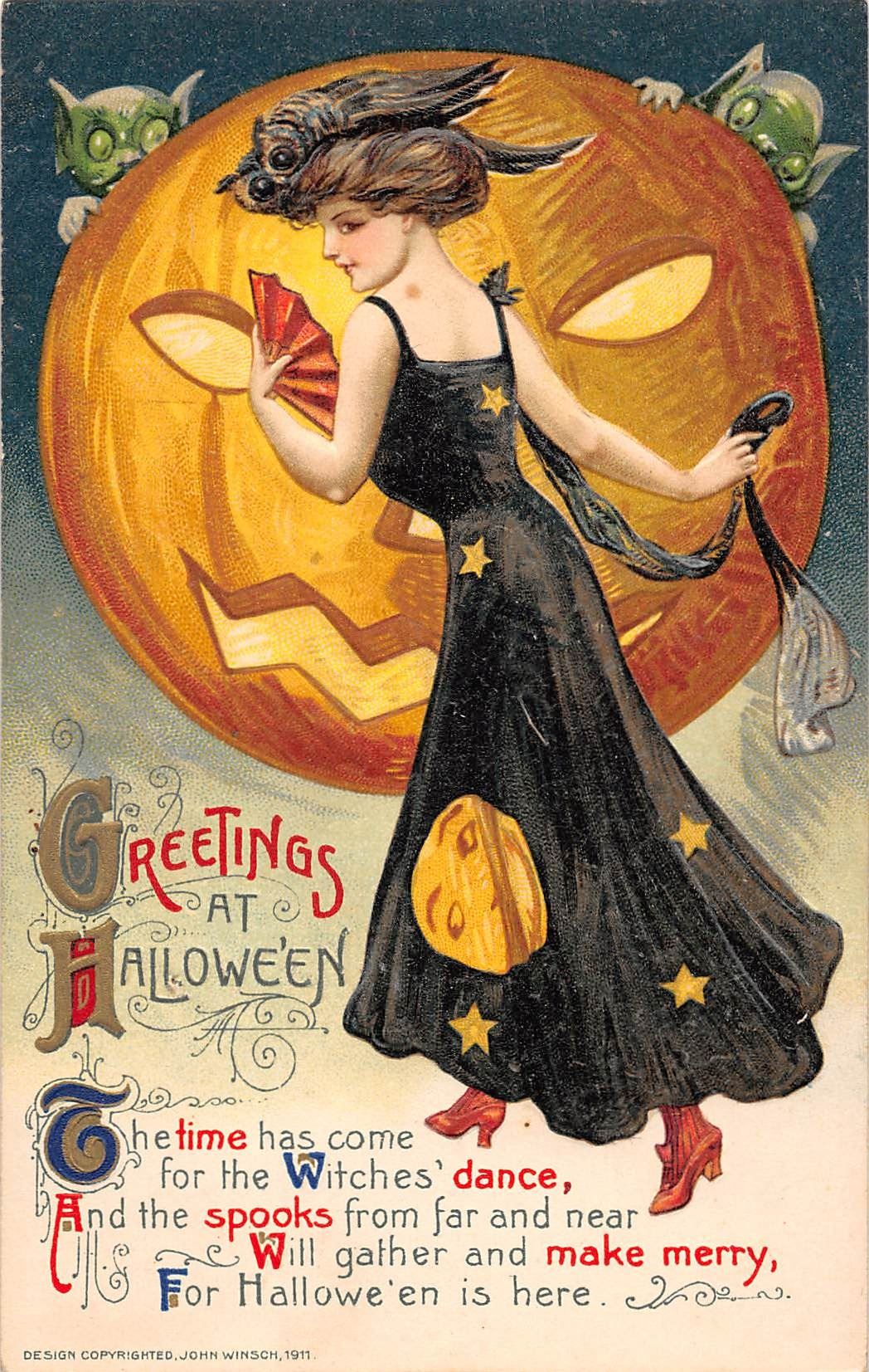Greetings at Halloween Lady In Front of Pumpkin Winsch Holiday Postcard