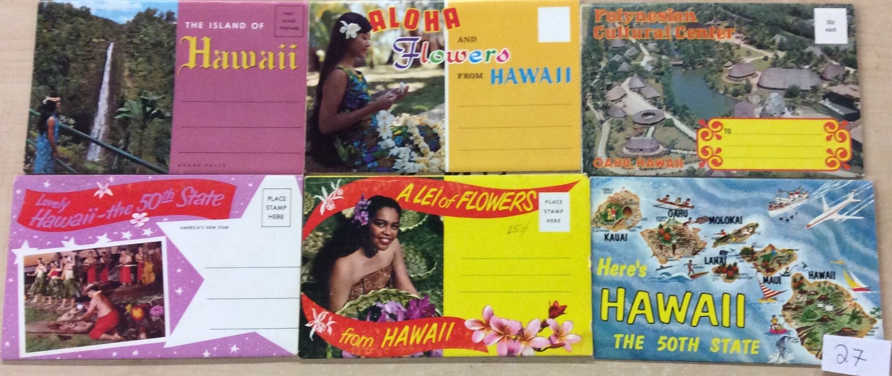 Group of 6 different Hawaii postcard folders. Each folder shows many different views from all over Hawaii. Over 50 years old.