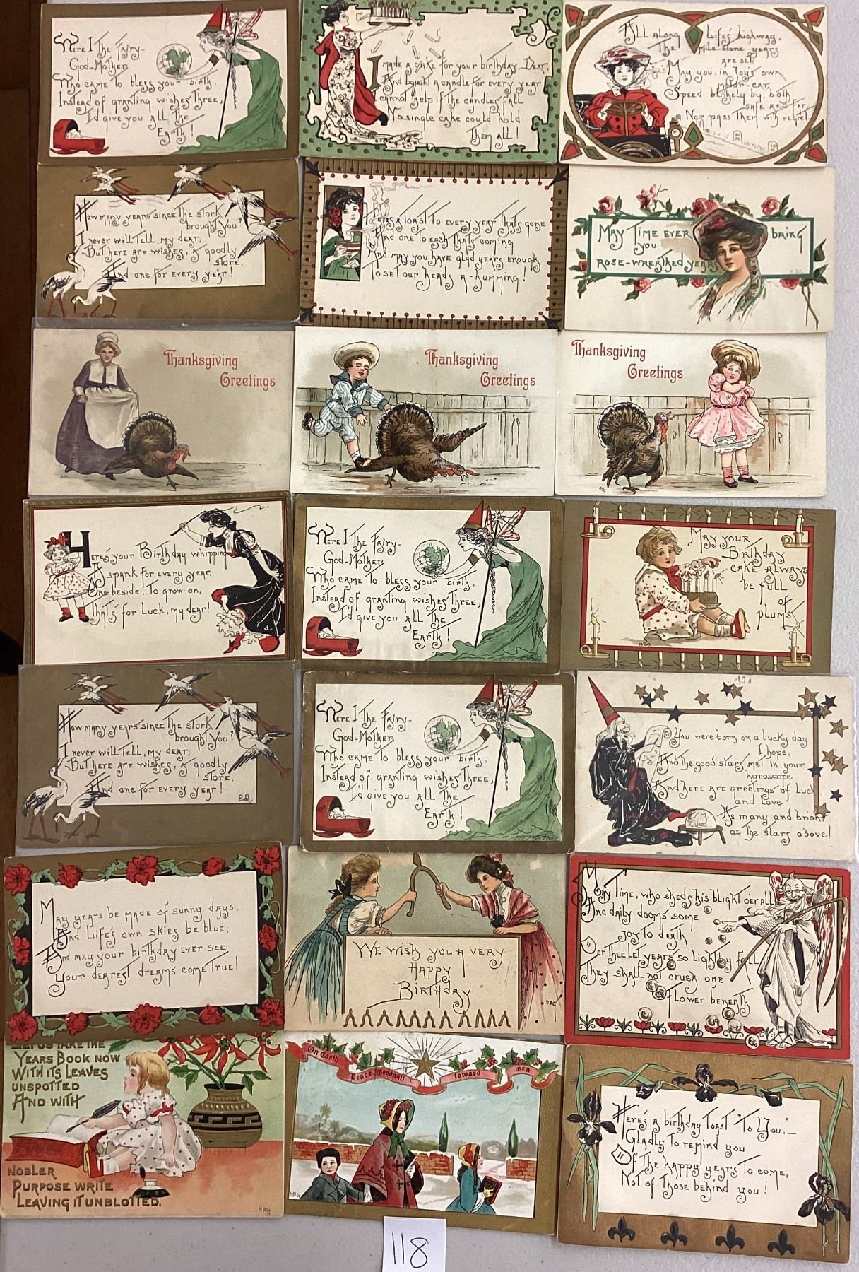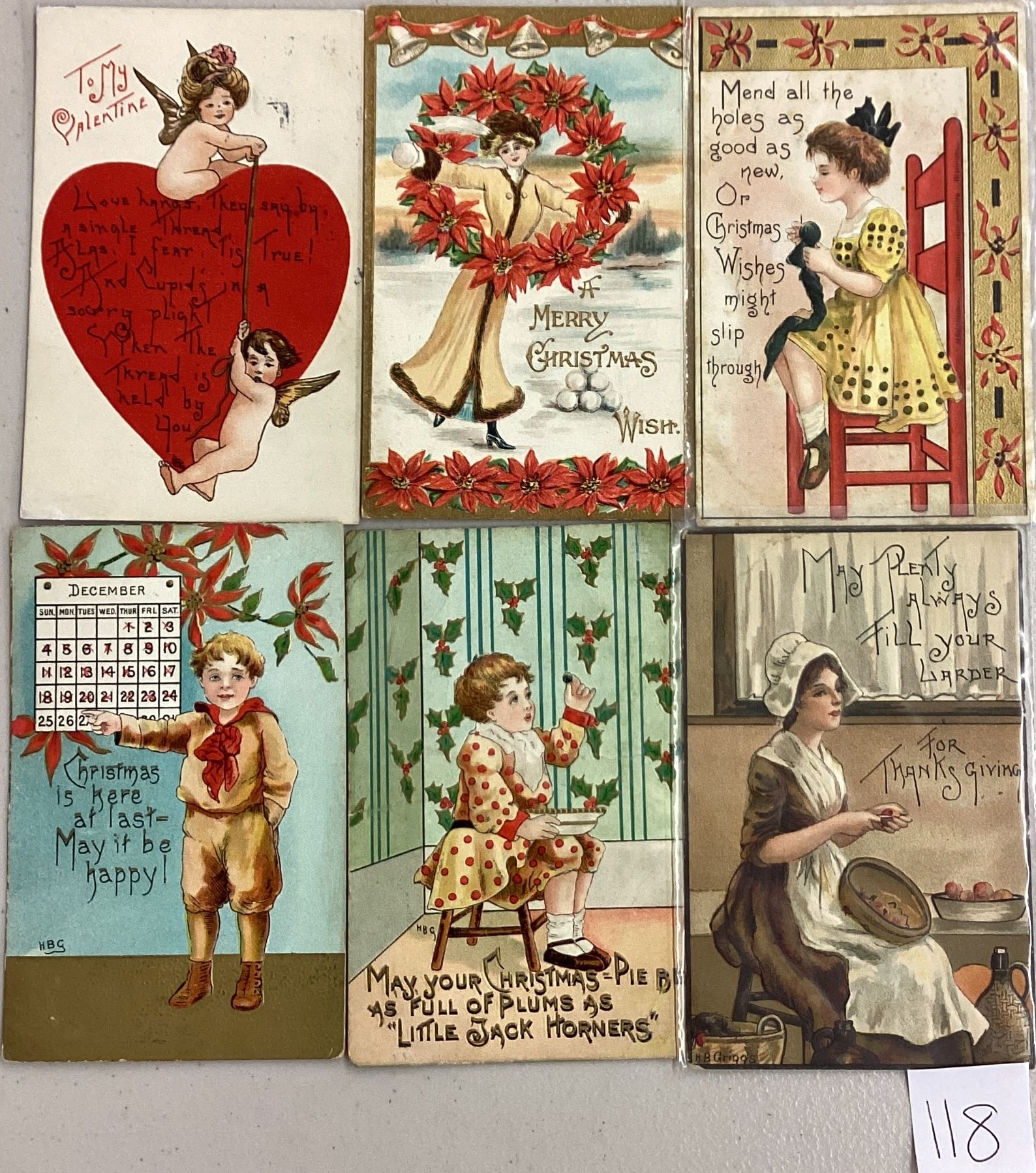 45 HBG holiday postcards. Ladies, children, Thanksgiving, Christmas, Valentine, etc. Some cards with wear.