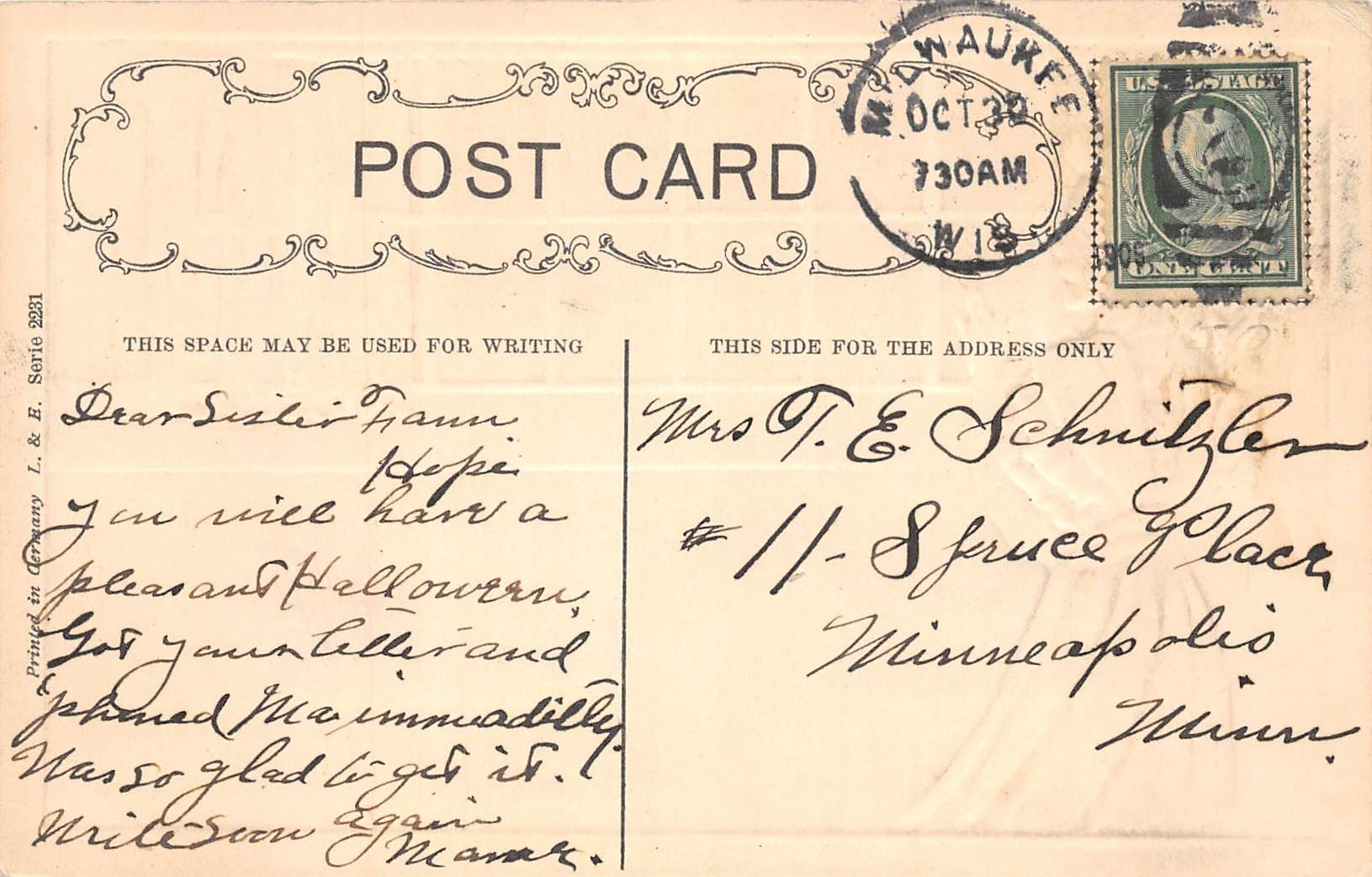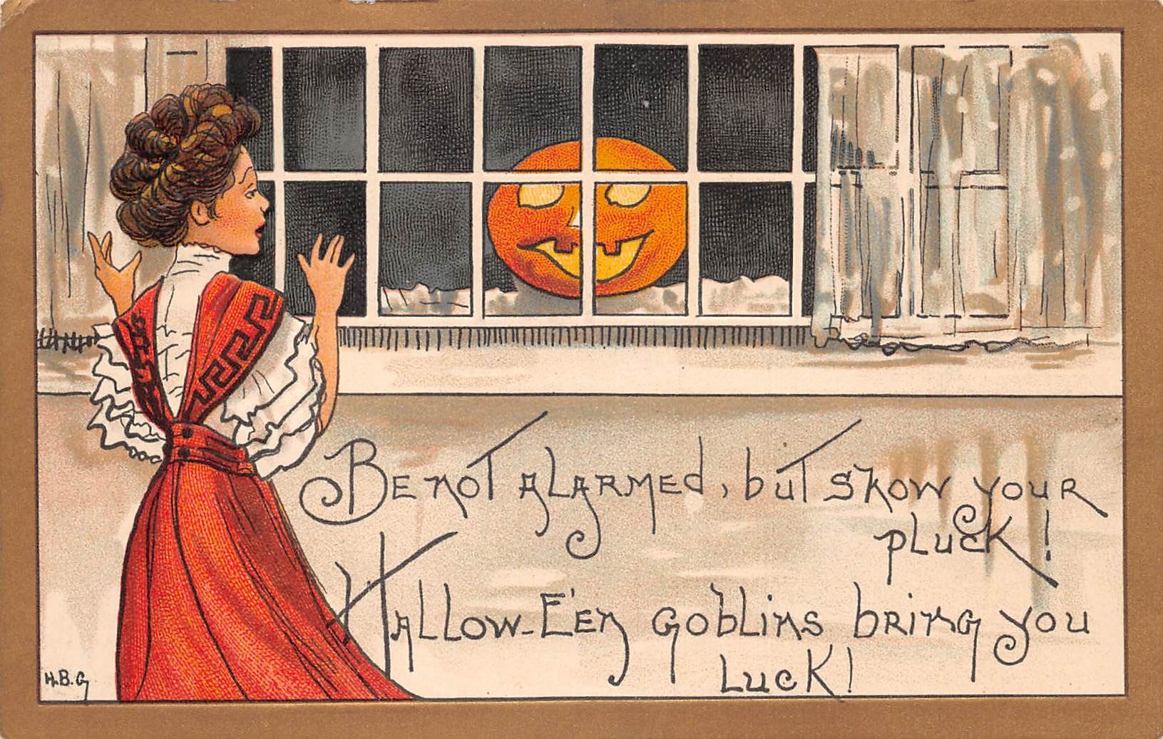 HBG Halloween Woman & Pumpkin at Window Holiday Greeting Postcard