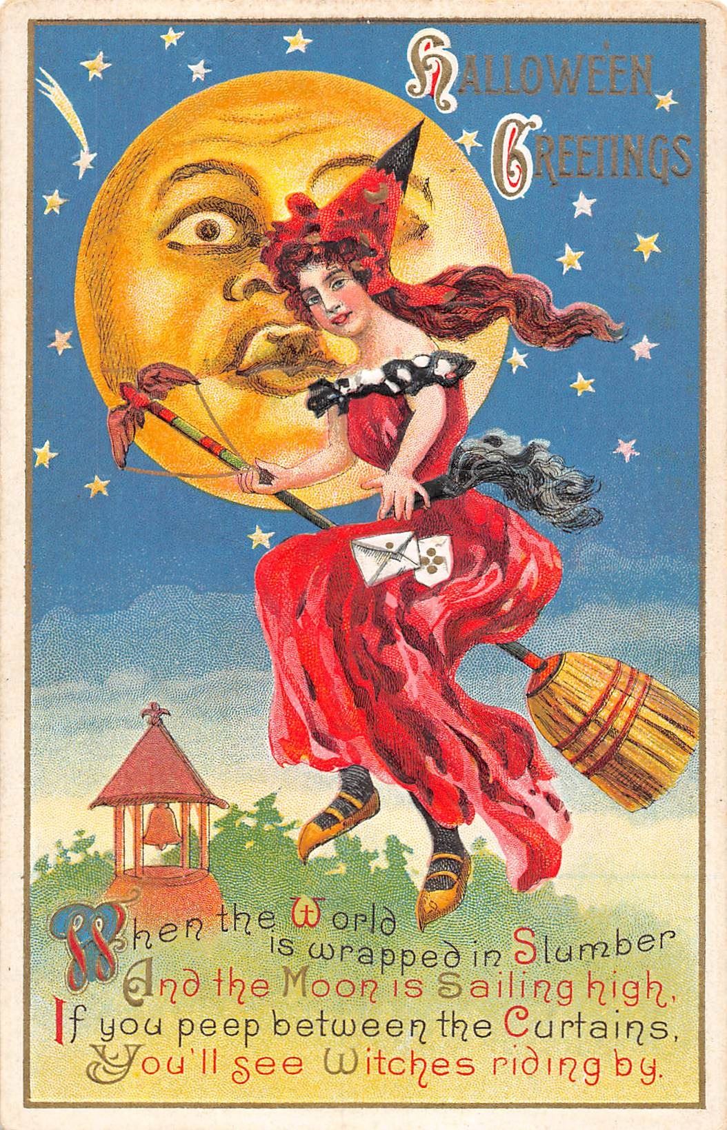 Halloween Greetings Witch On Broom In Front Of Moon Face Postcard