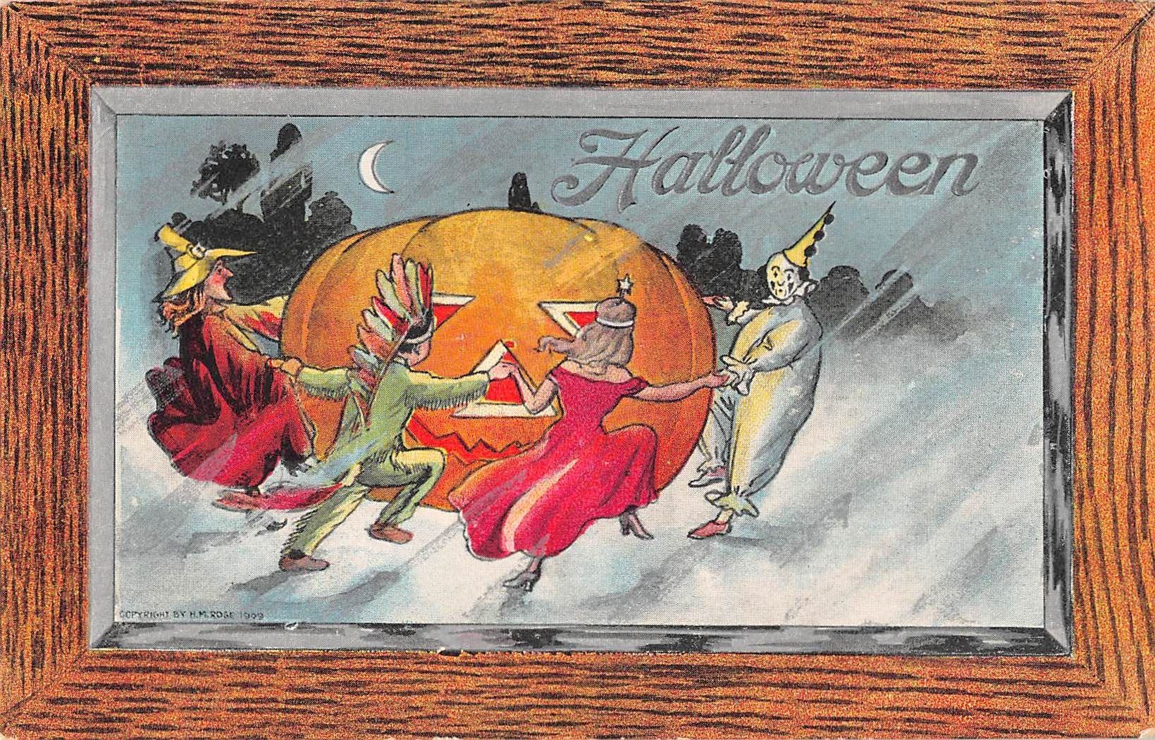 Halloween Witch, Clown, Indian, Girl Dancing Around Pumpkin Holiday Greeting PC