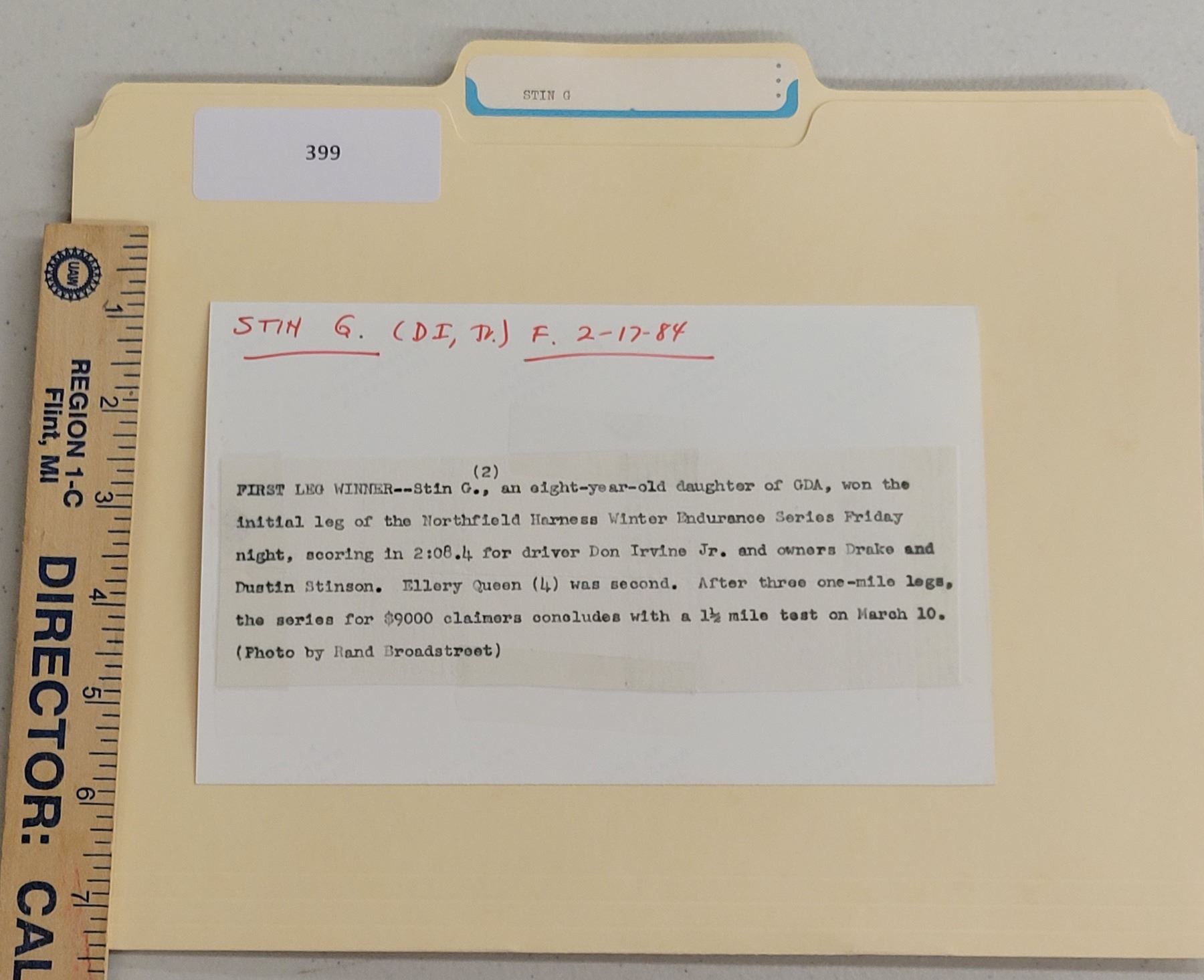 Harness Racing, Featuring Horse Stin G, Driver Don Irvine, Jr., Northfield Harness Raceway, 1 Photo