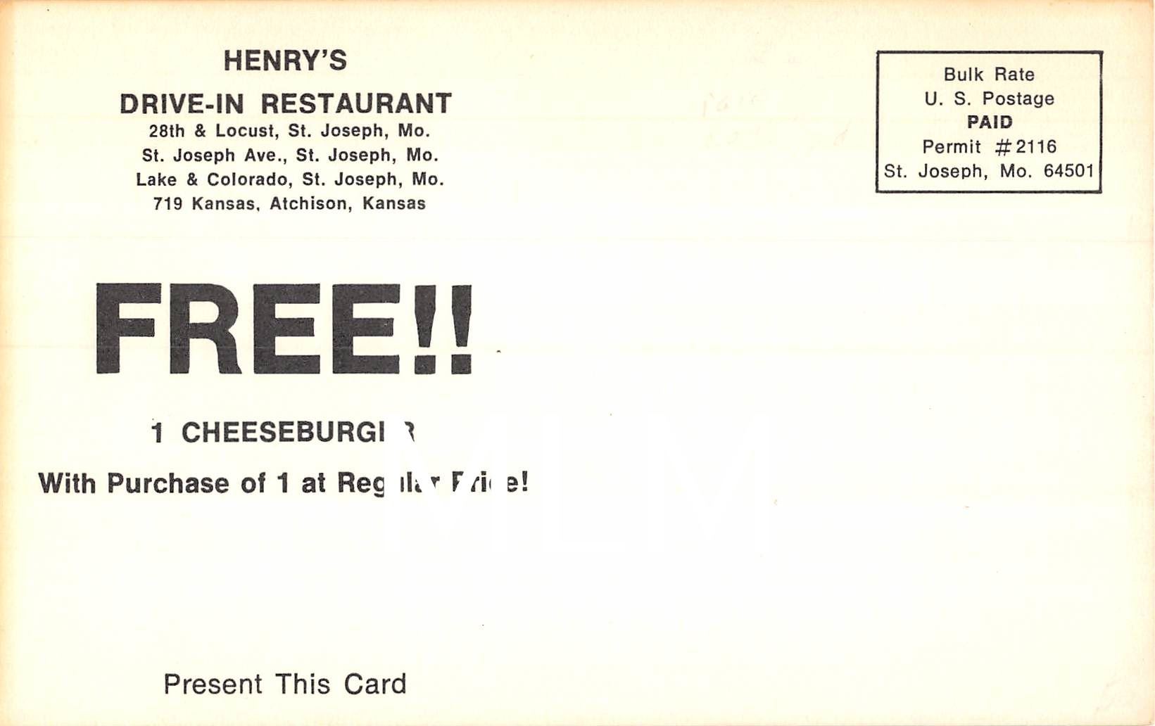 Henry's Hamburgers St. Joseph, MO/Atchison, KS Advertising Postcard