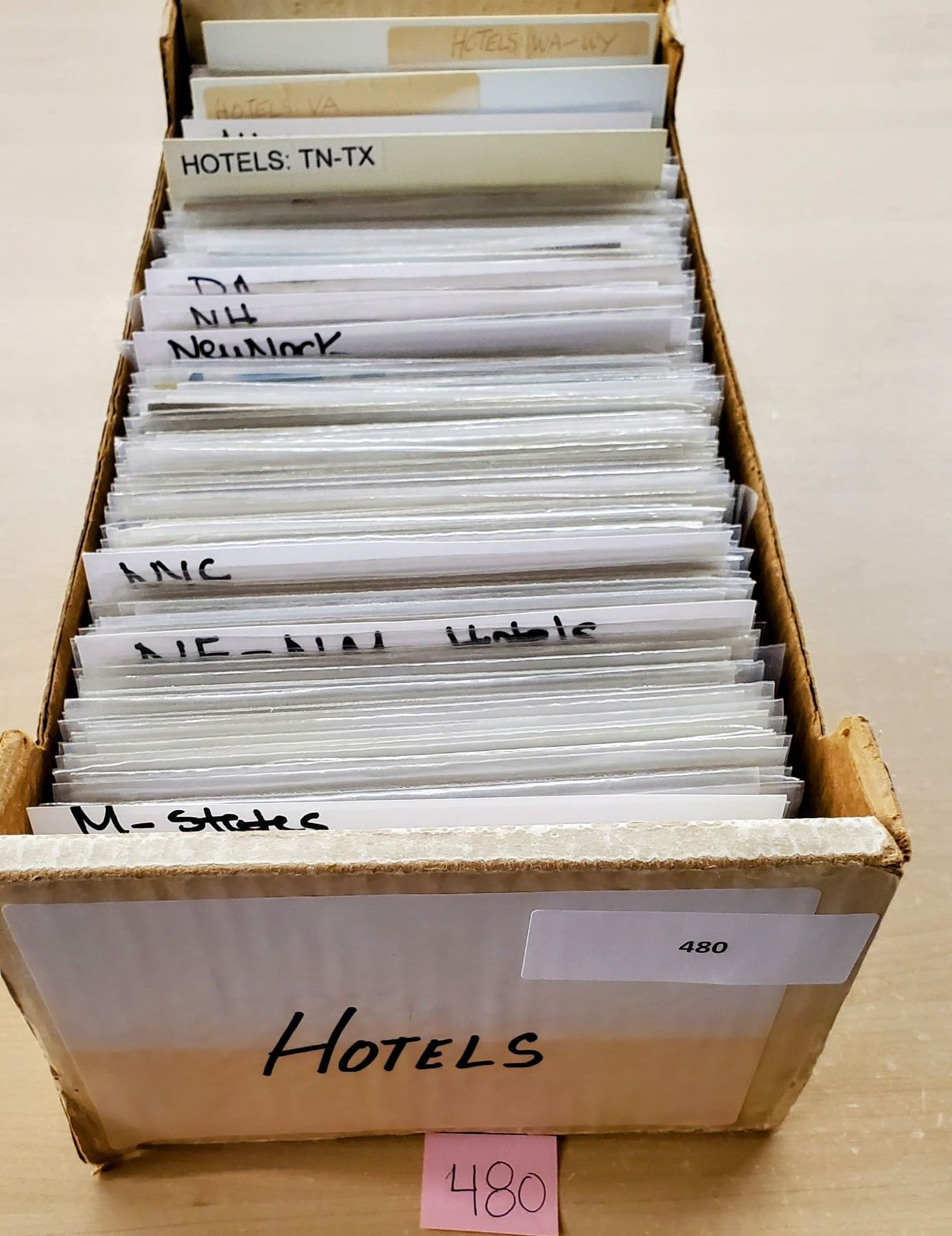 Approx. 500 hotel postcards. Mostly sorted. New York, New Hampshire, Pennsylvania, Tennessee, Virginia and others.