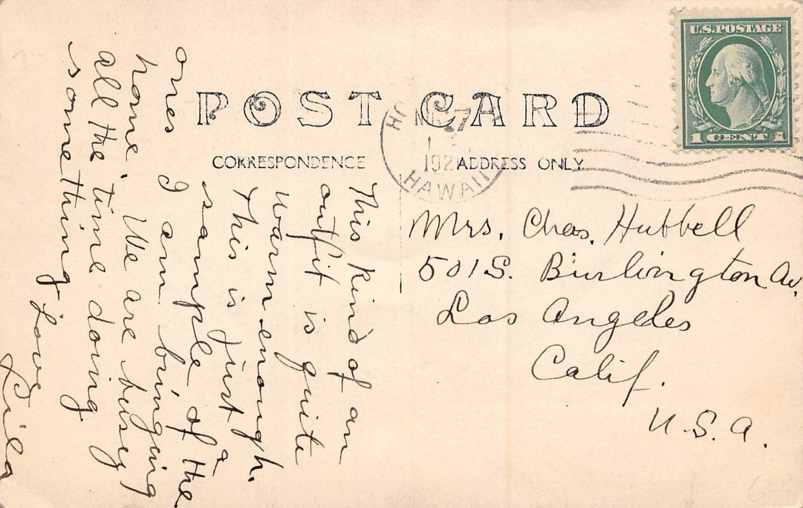 Message talks about bringing the outfits home. Postmarked in the twenties.
