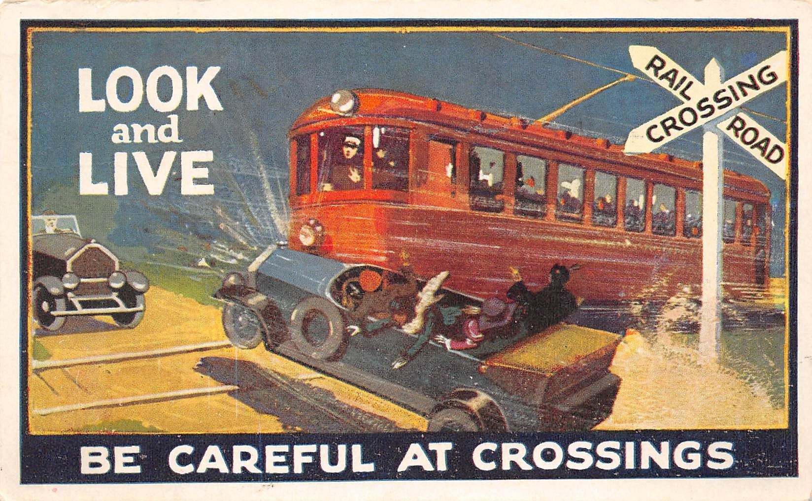 Look & Live Be Careful At Rail Crossing Auto Crash & Trolley Postcard
