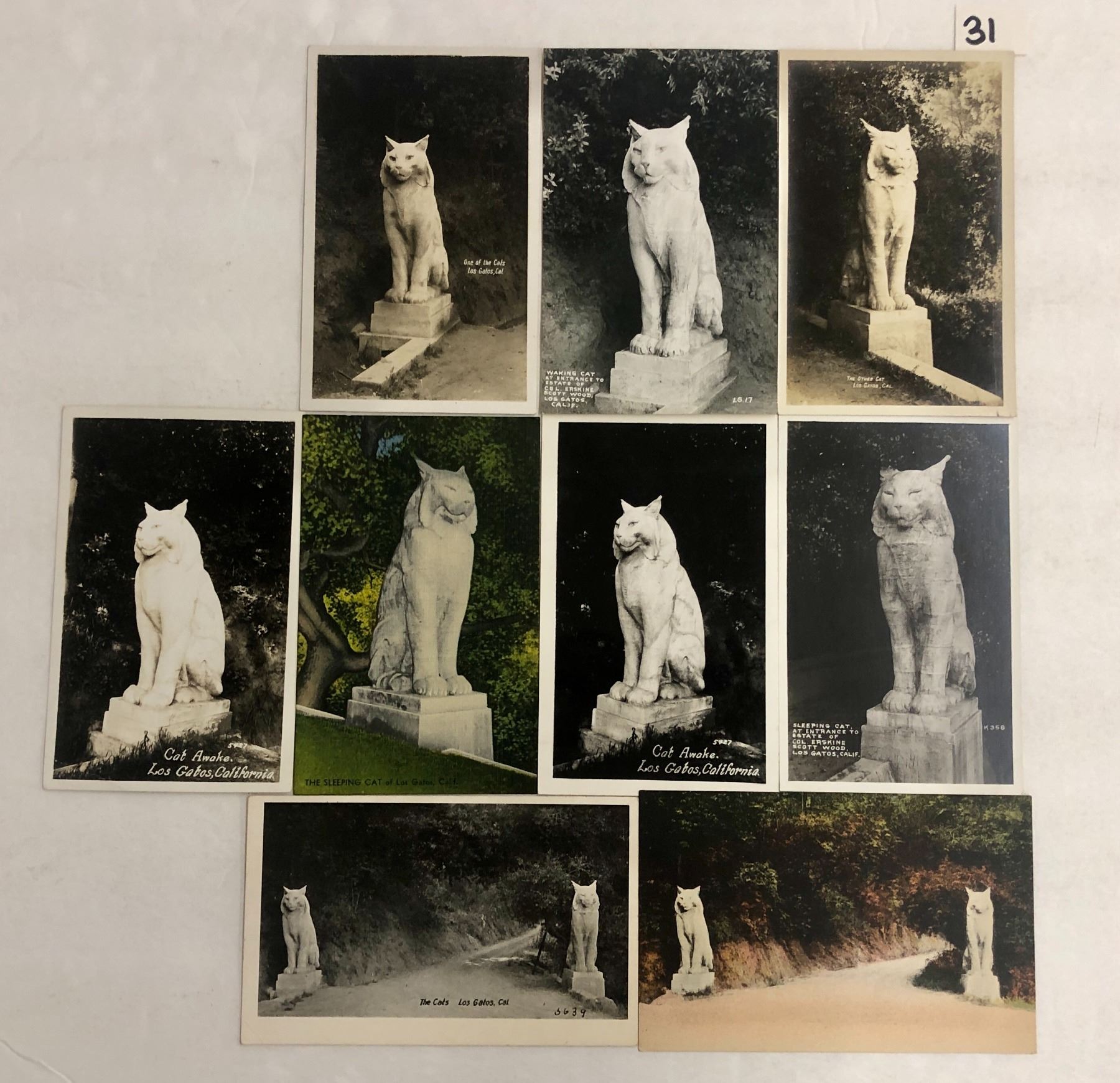 9 Los Gatos Cat statue postcards. 5 real photo.