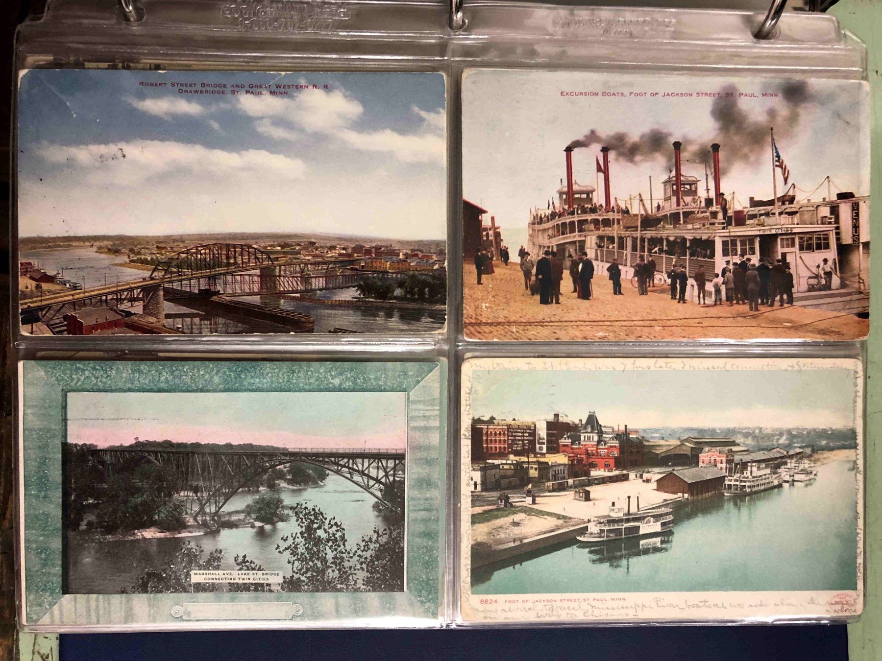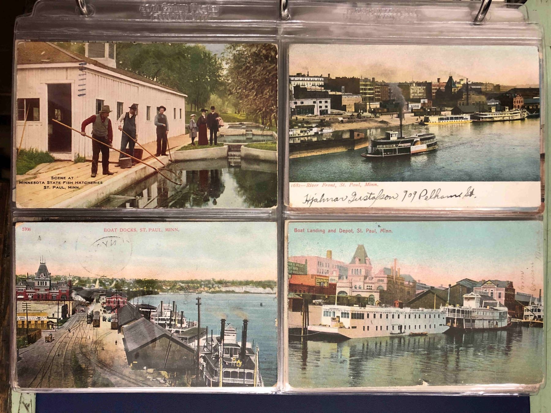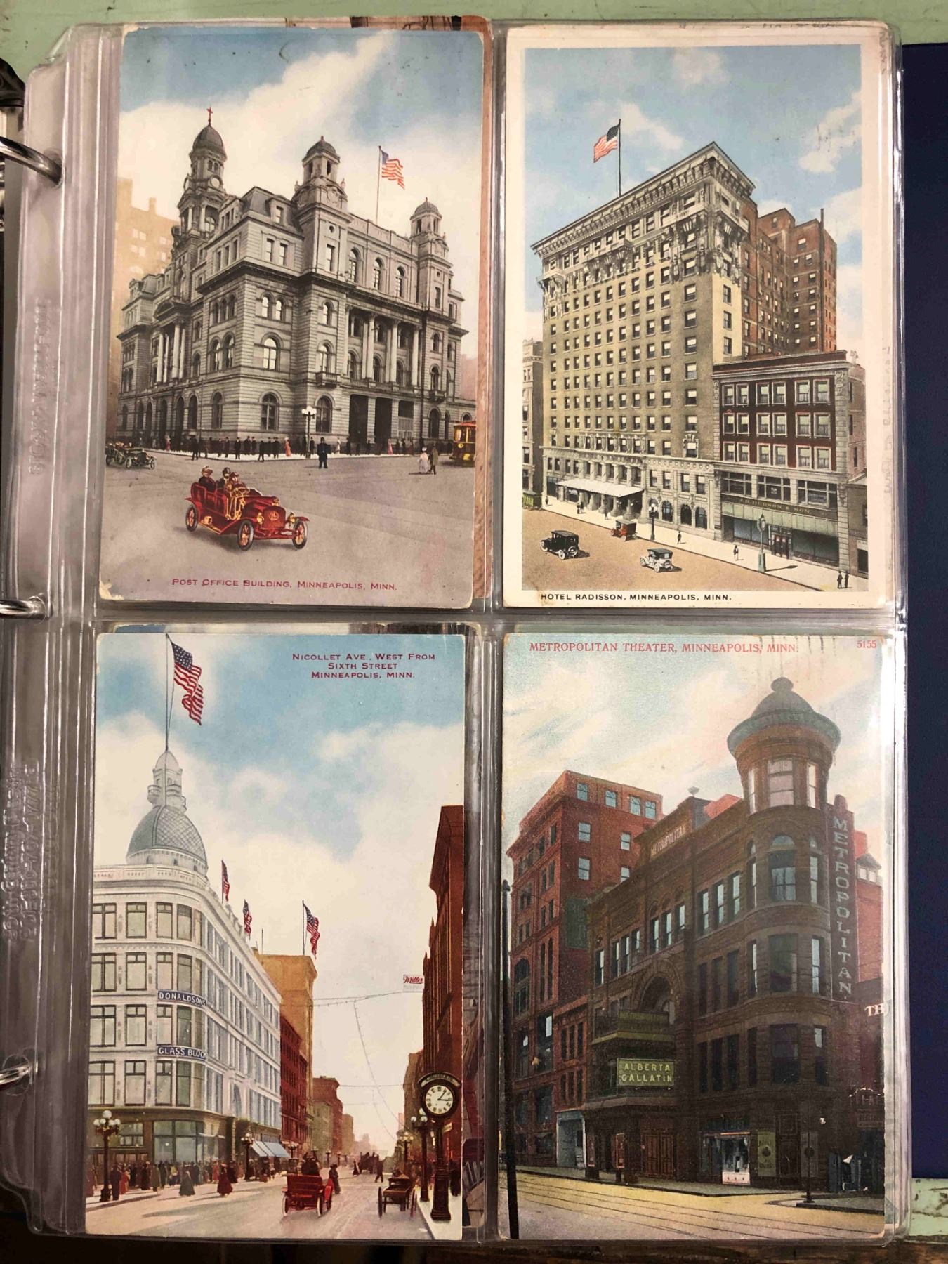 2 Albums, over 300 cards. All early pre linen. Views of Minneapolis & St. Paul. Street Scenes, harbors, transportation, Theaters & More.