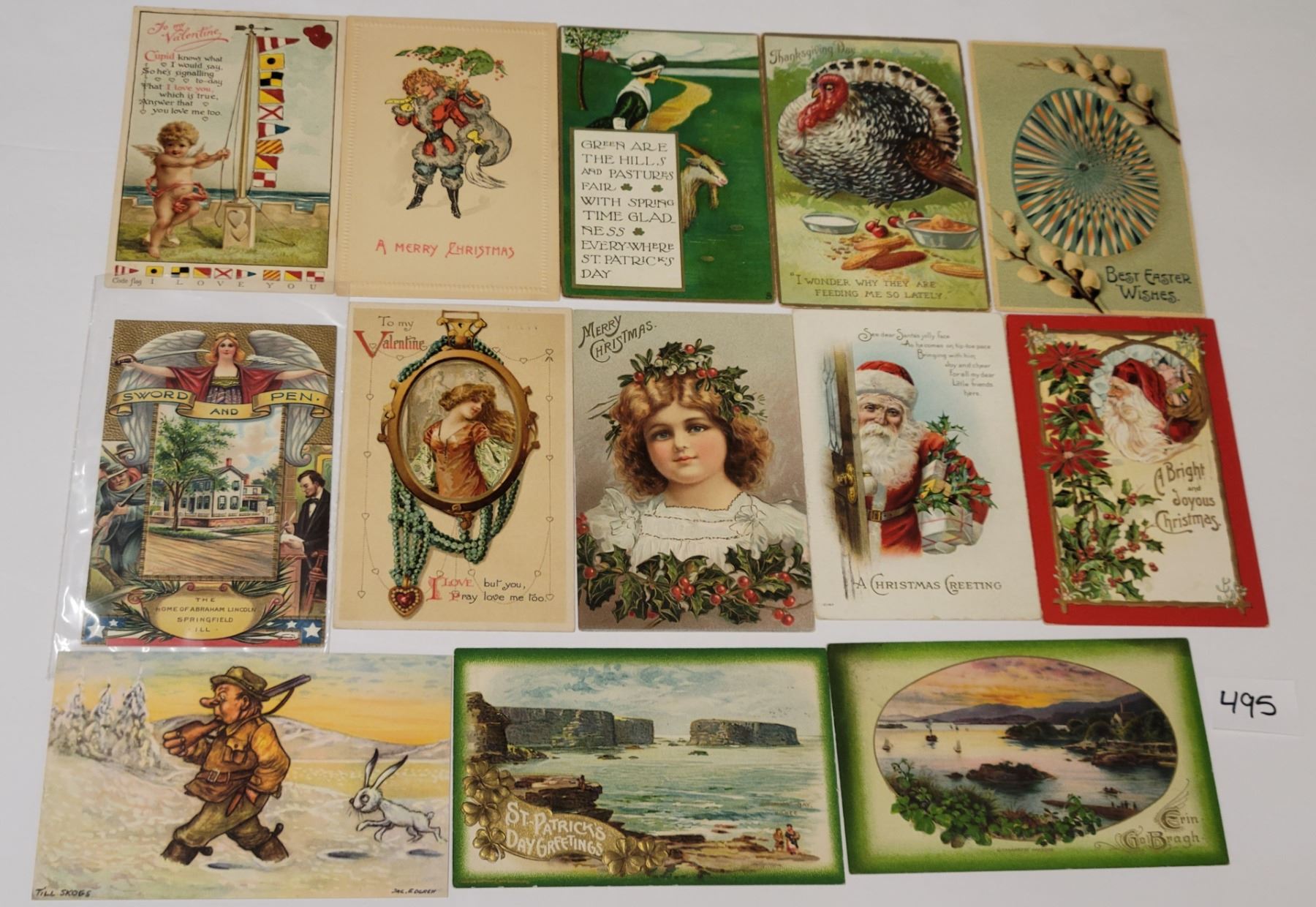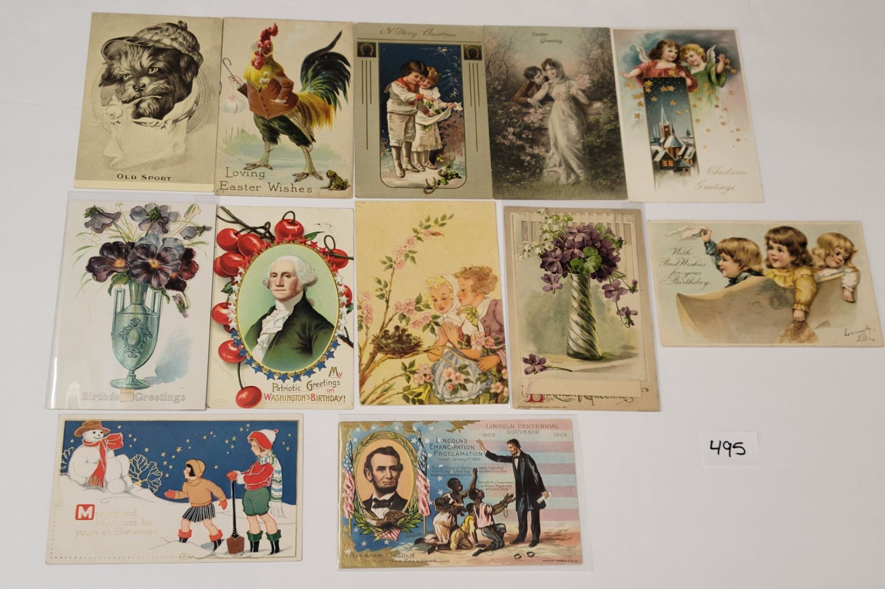 25 holiday greeting postcards. Animals, publishers, artists, children, Santa, patriotic, etc.