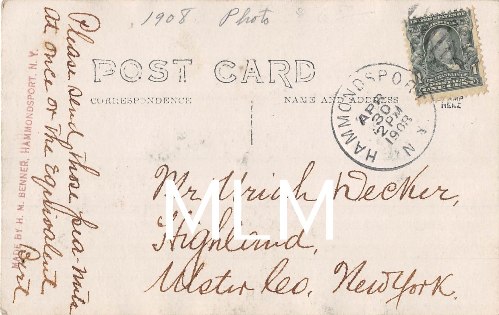 Made by H.M. Benner, Hammondsport, NY. Postmarked 1908.