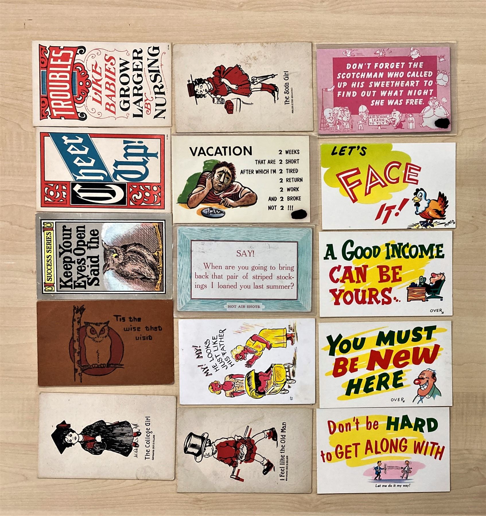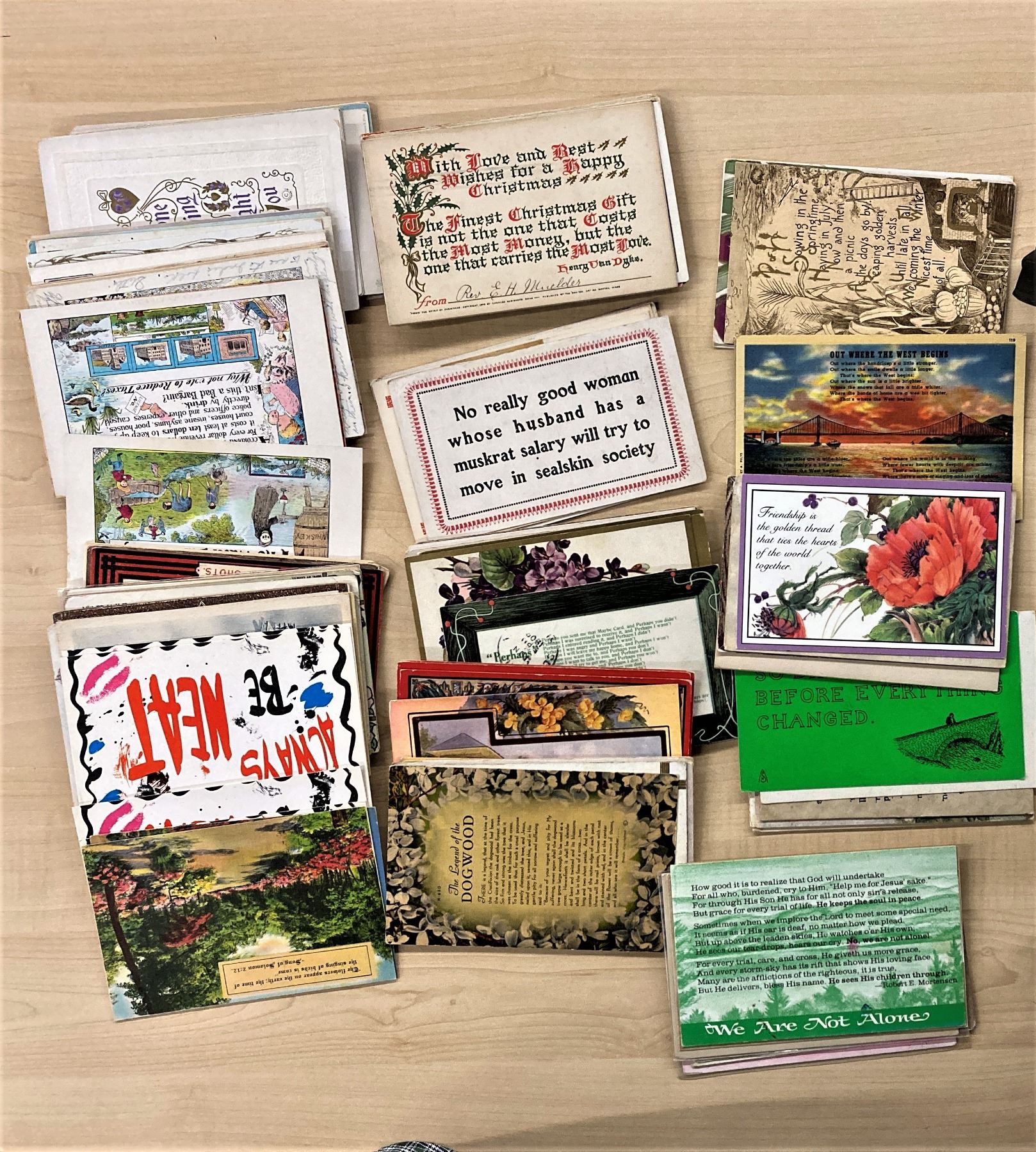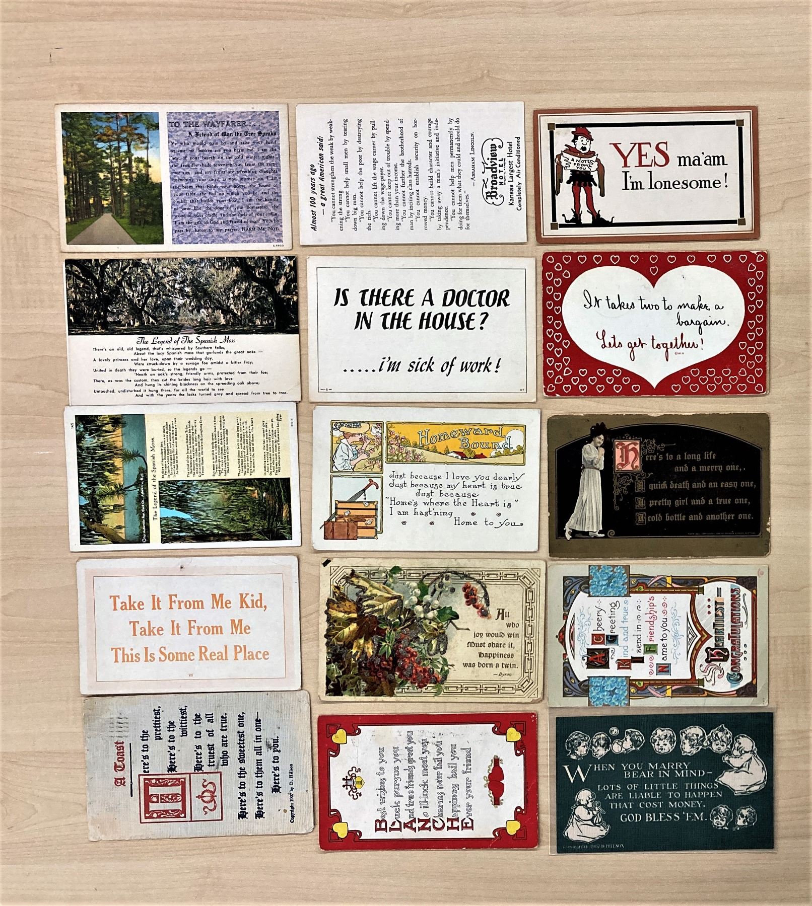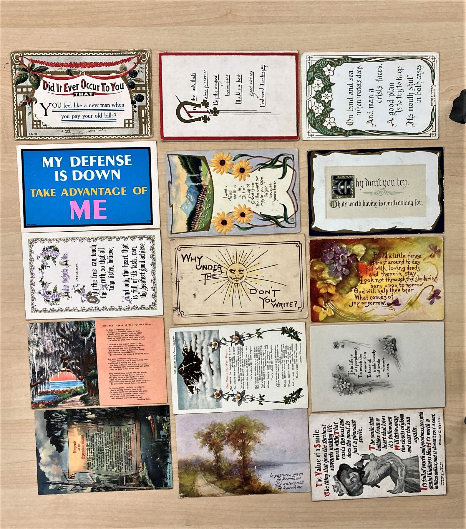 Poems, sayings, jokes etc. Mostly all early. 500+ cards. Pictures shown are just a portion of the lot.