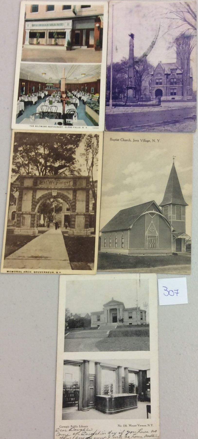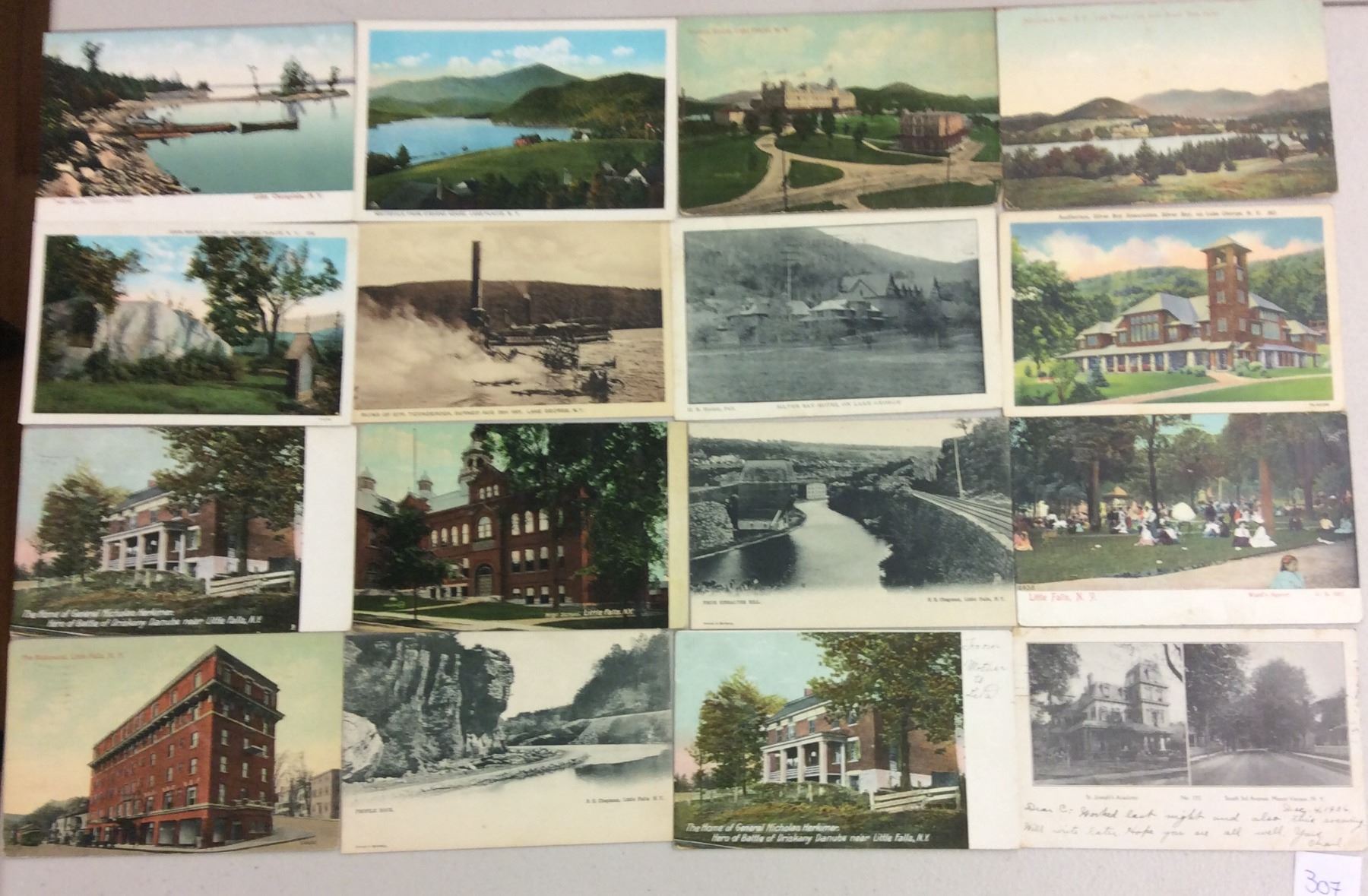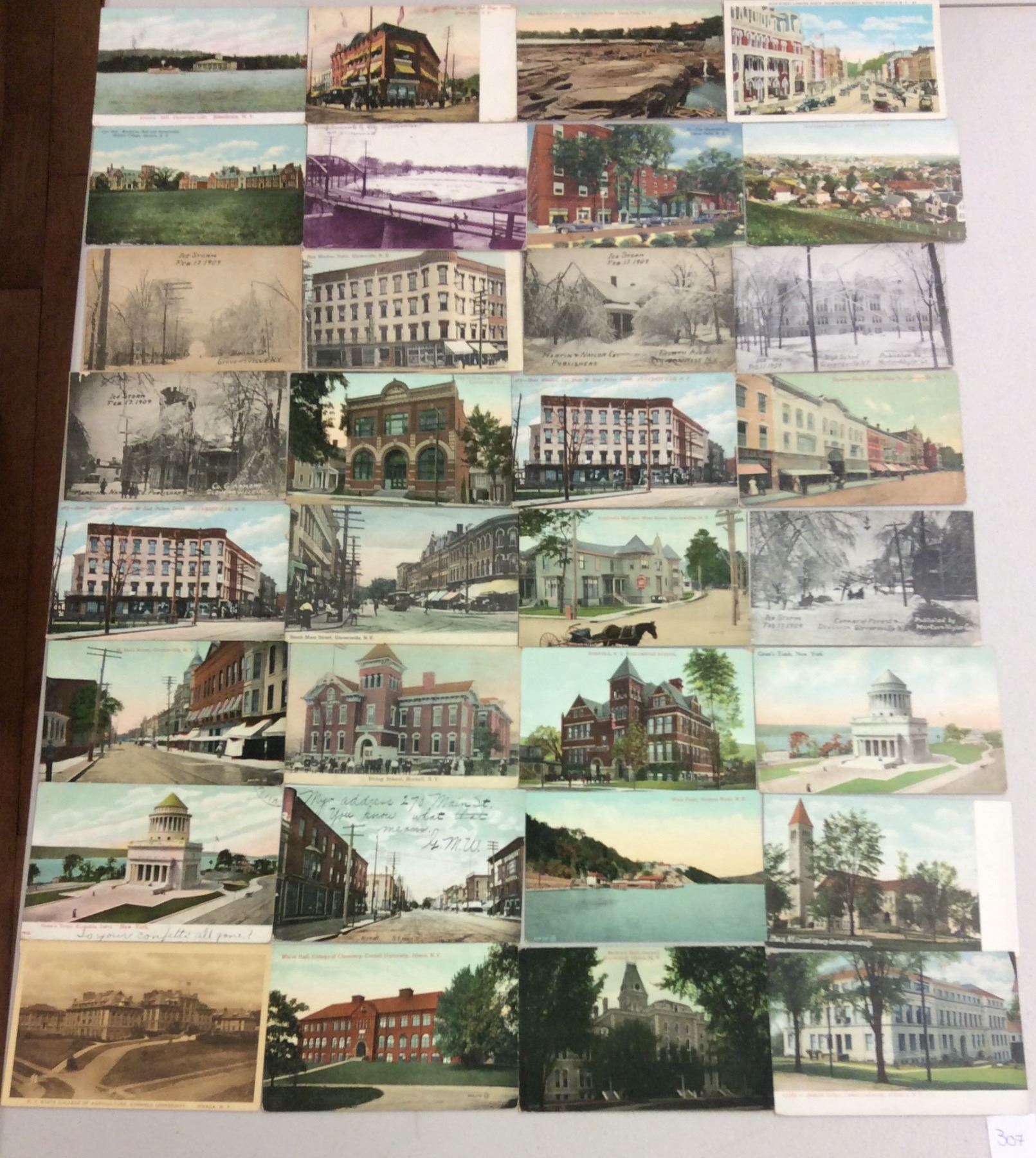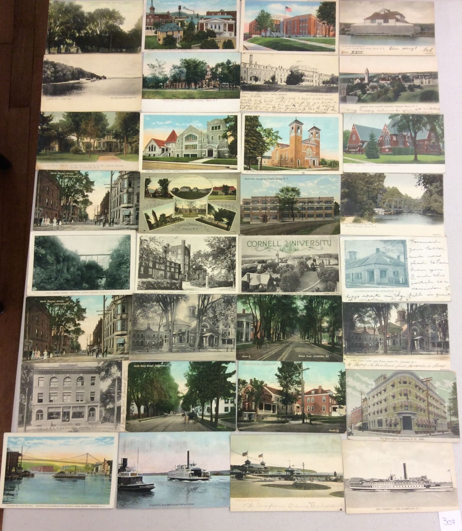 Over 625 NY postcards. Sorted into at least a dozen towns. Mostly early to linen.