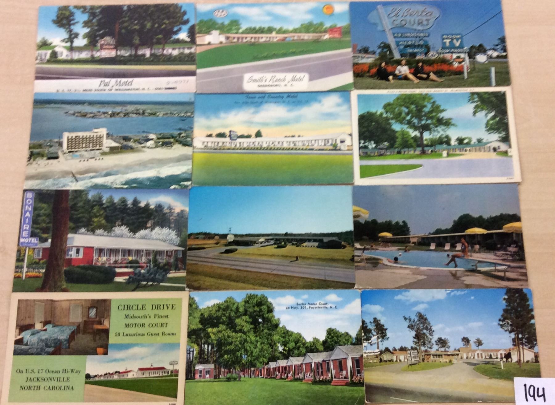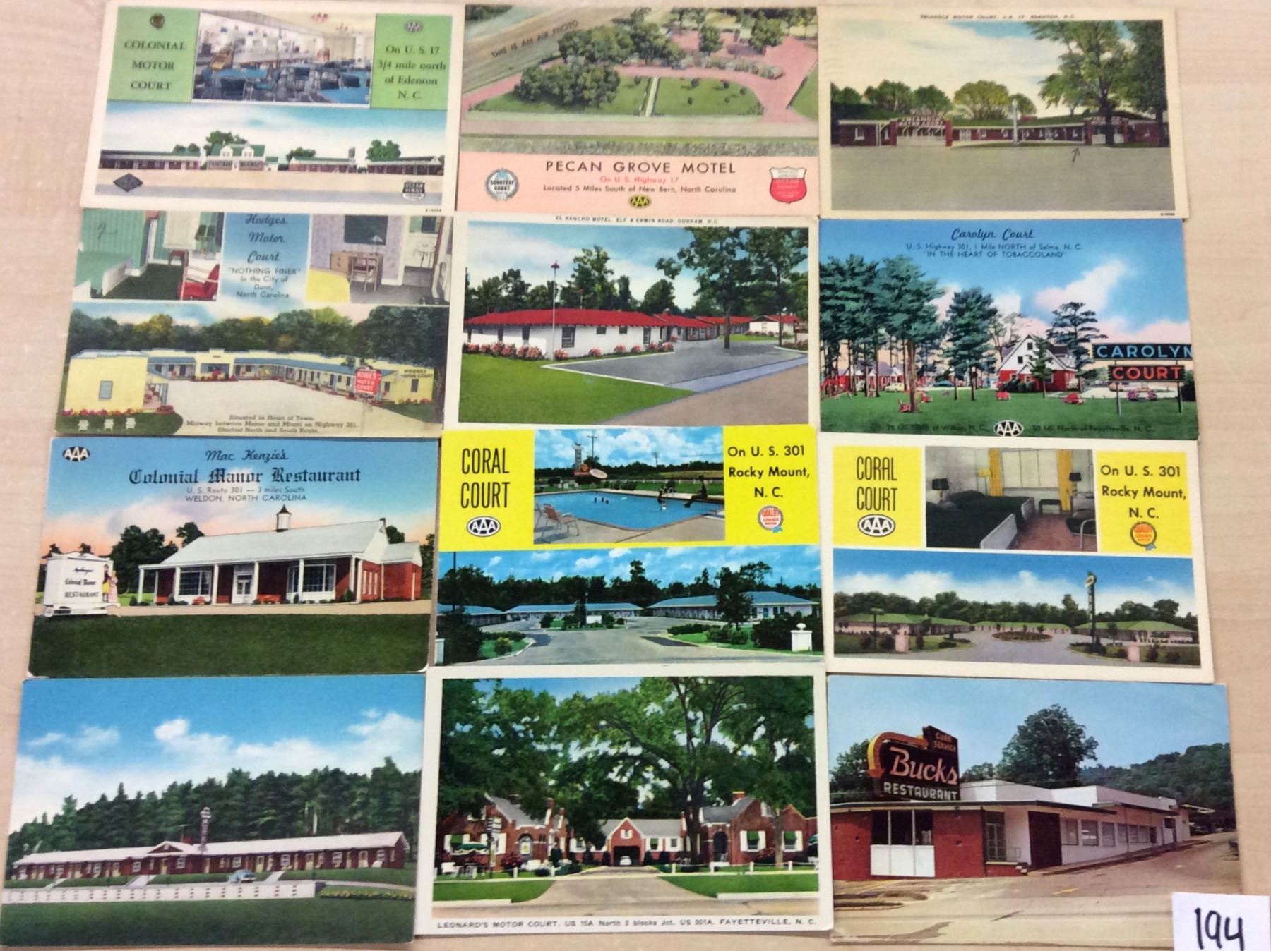 150 roadside NC postcards. Linen to standard size chrome. Hotels, motels, restaurants, etc. Pictures shown are just a portion of the lot.