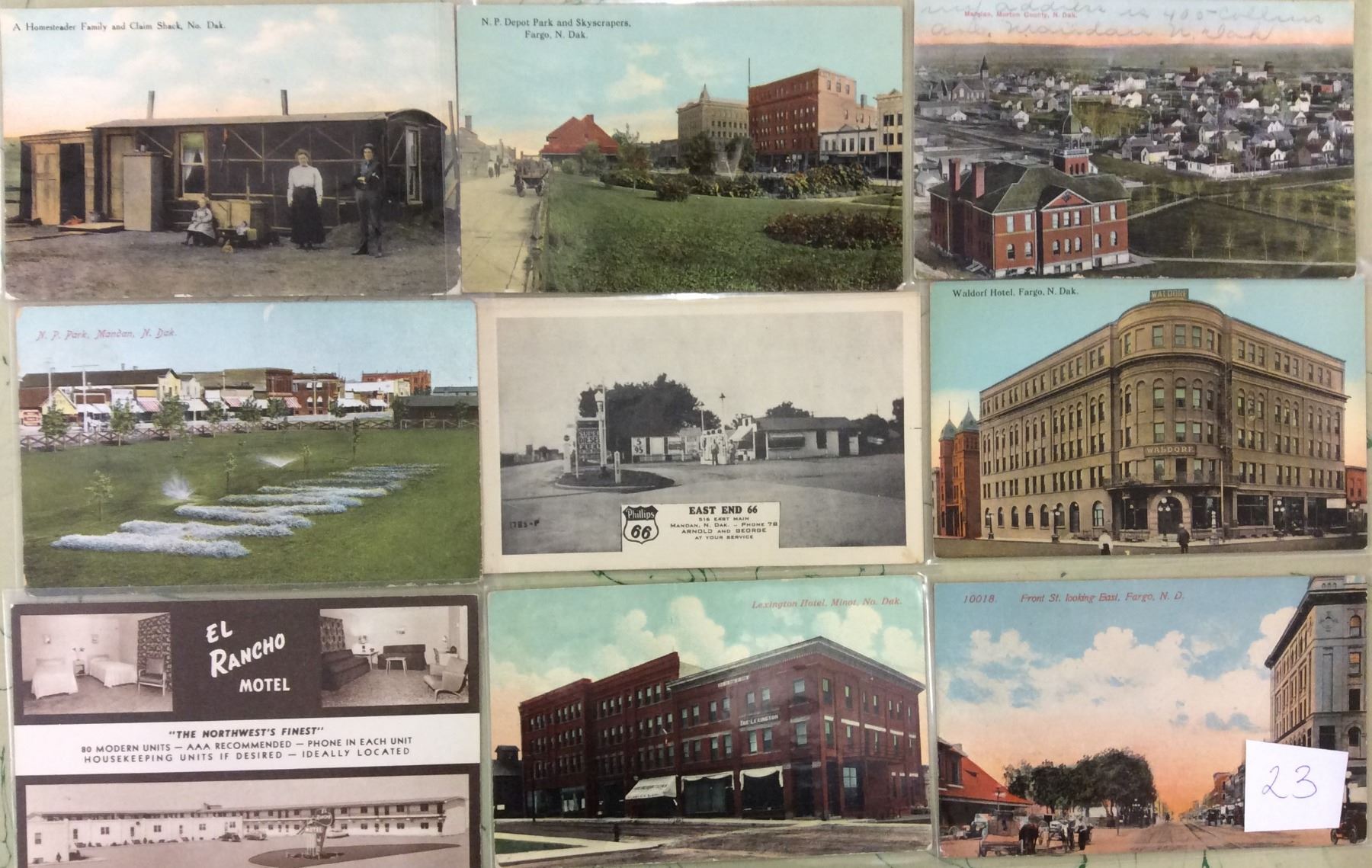 Over 75 ND postcards. Early to linen. Street scenes, trains, hotels, buildings, etc. Pictures shown are just a portion of the lot.