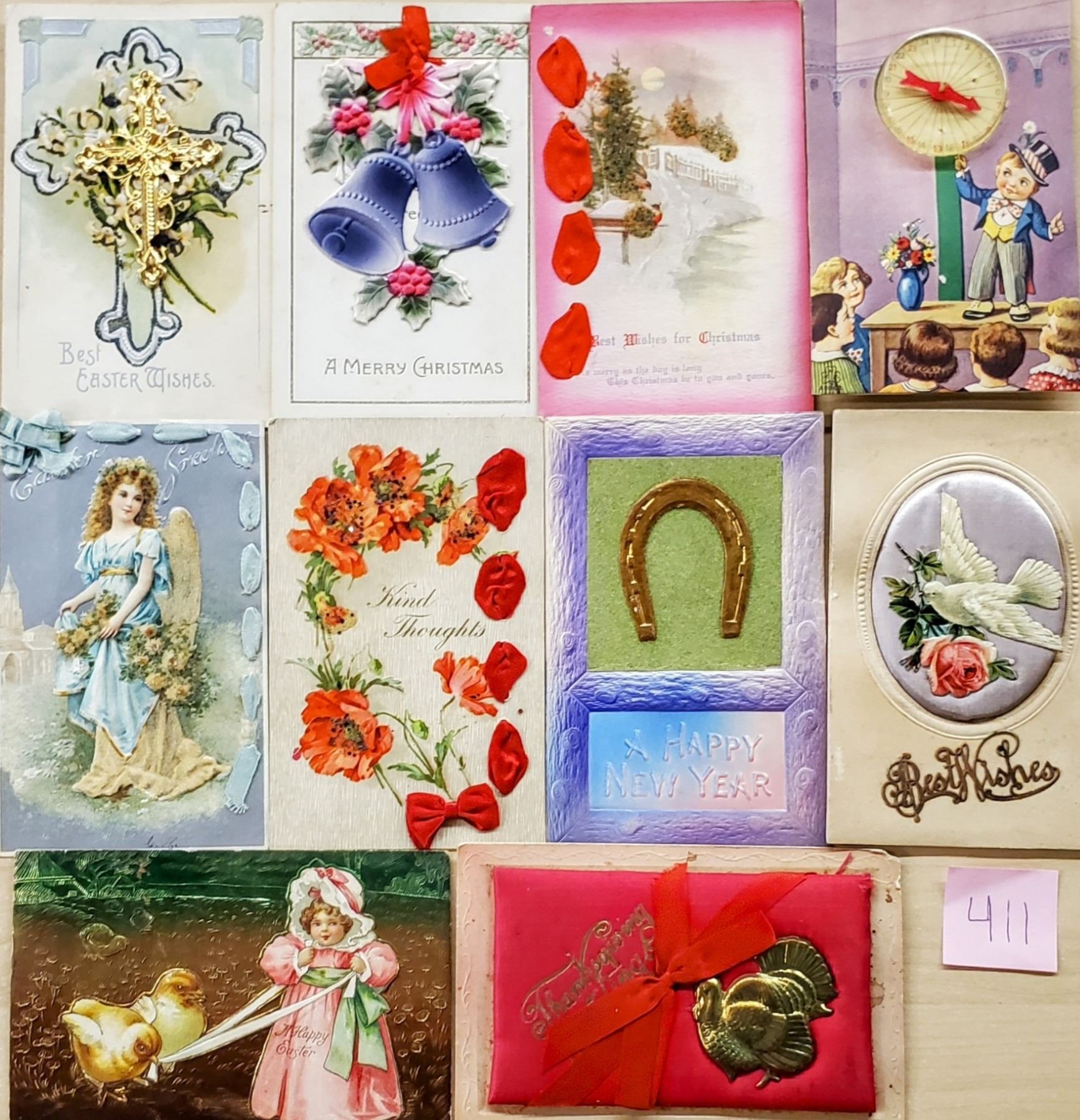 Approx. 45 novelty psotcards. Attachments, pin cushions, ribbons, and more.