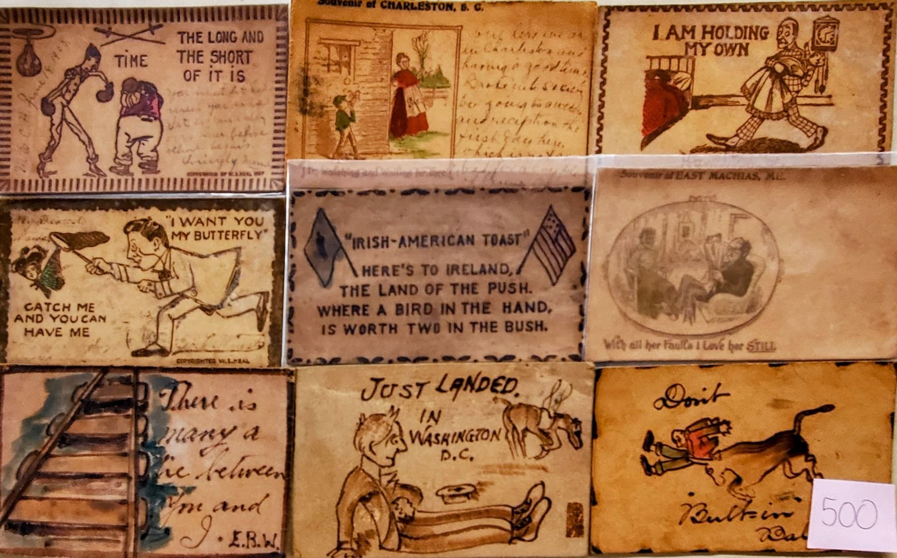 Over 60 early leather postcards.