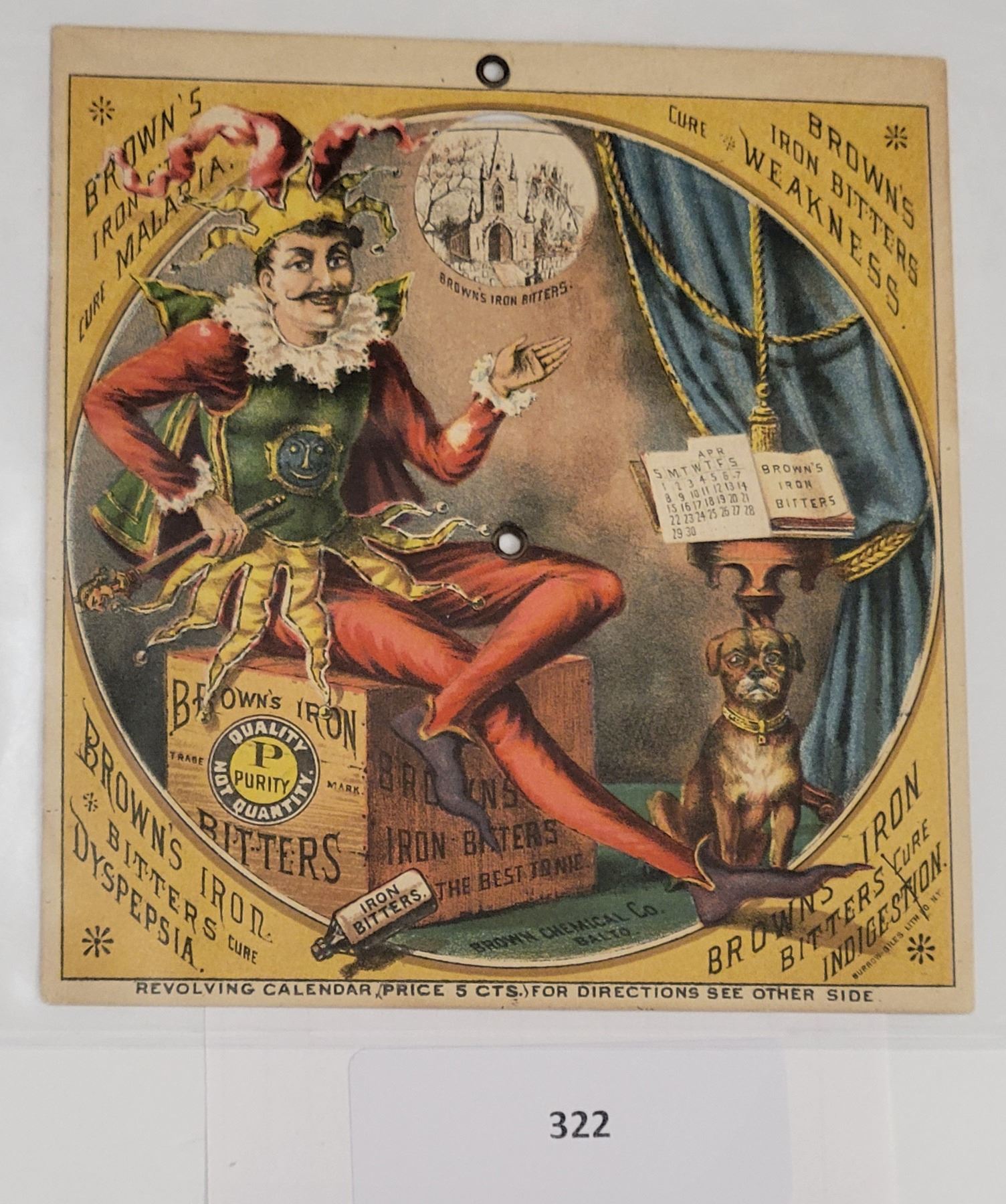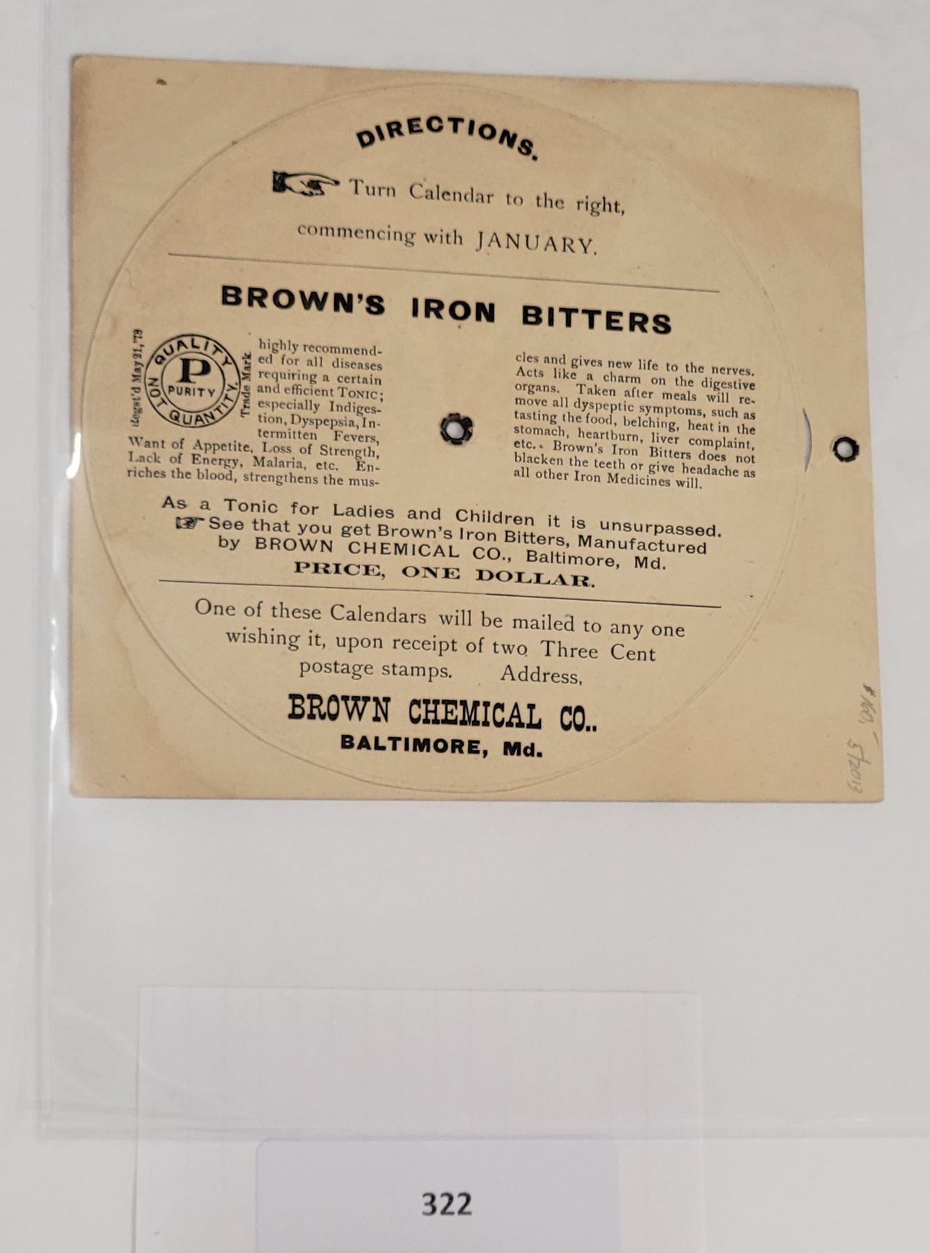 Novelty Mechanical Calendar Brown's Iron Bitters Baltimore, Maryland Trade Card