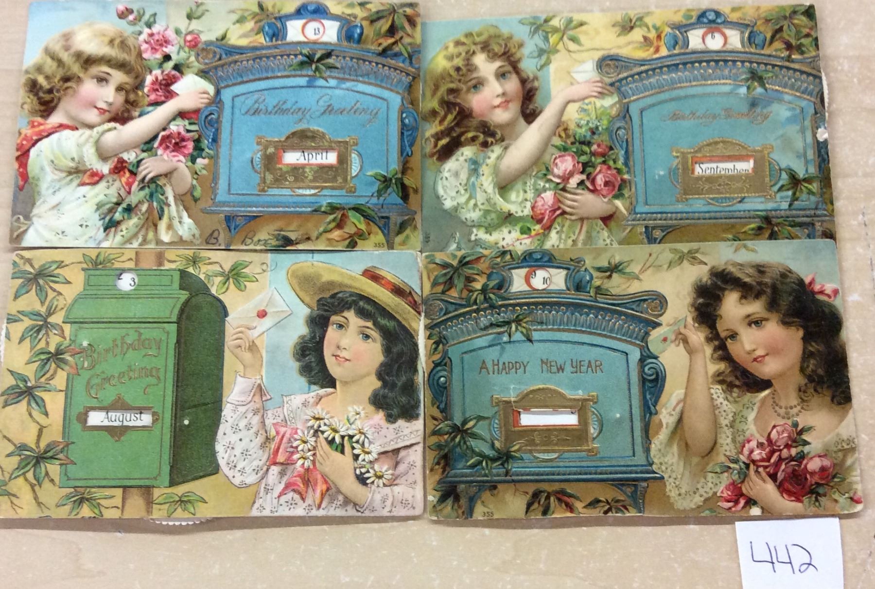 4 mechanical children and date postcards. Early.