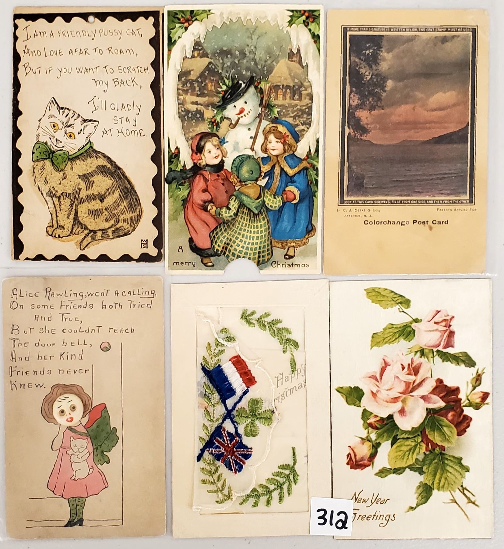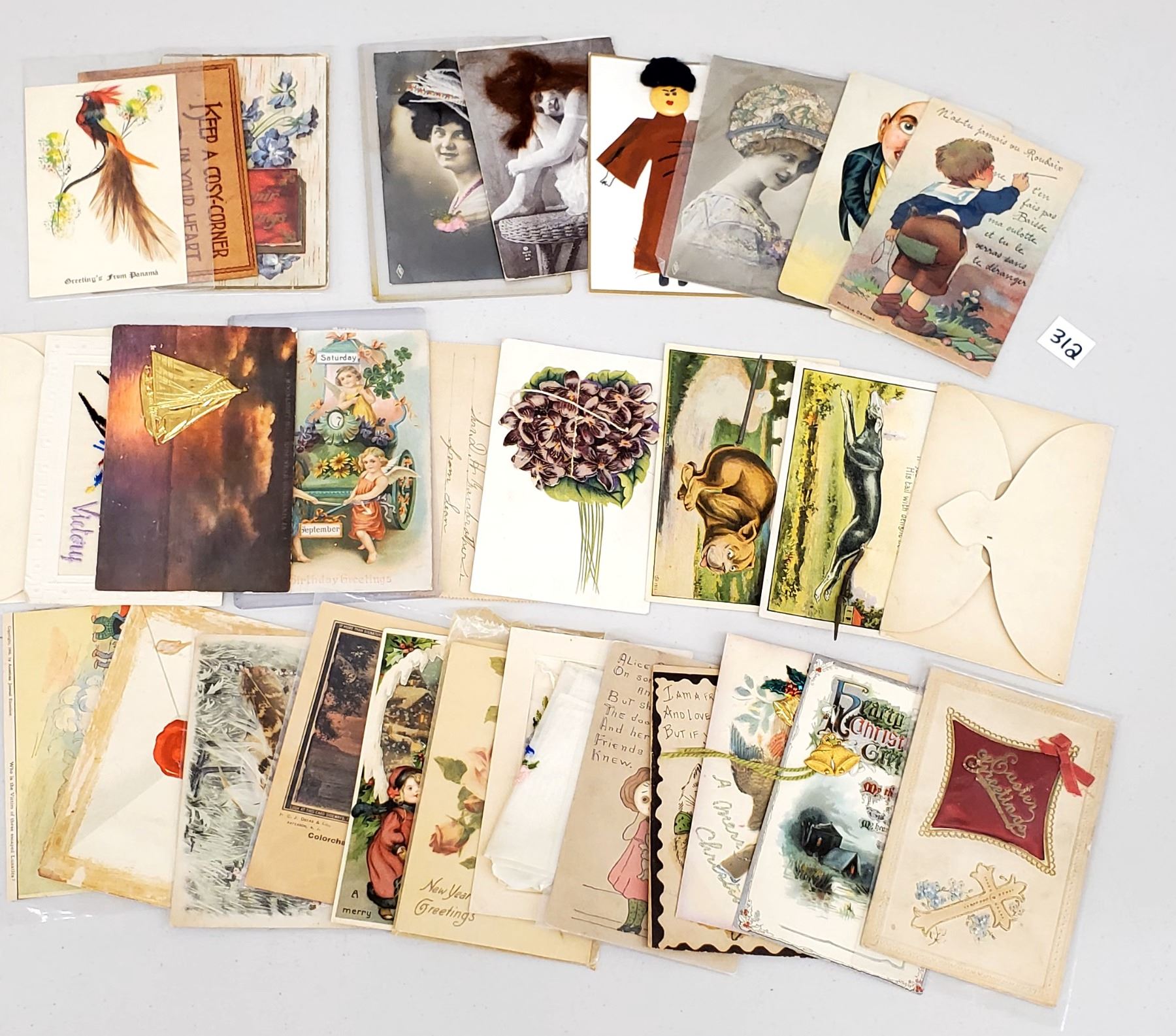 30 novelty postcards. Attachments, leather, booklets, mechanical, real hair, silk and more.